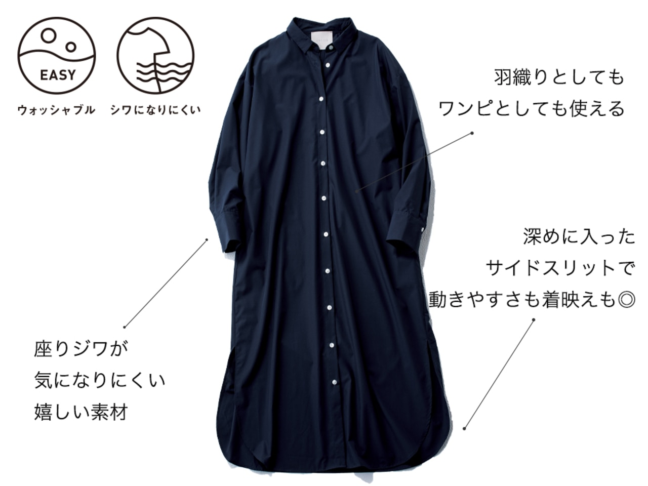 ヒップが隠れる安心丈に加え、INもしやすいデザインが着こなしの幅を広げます。