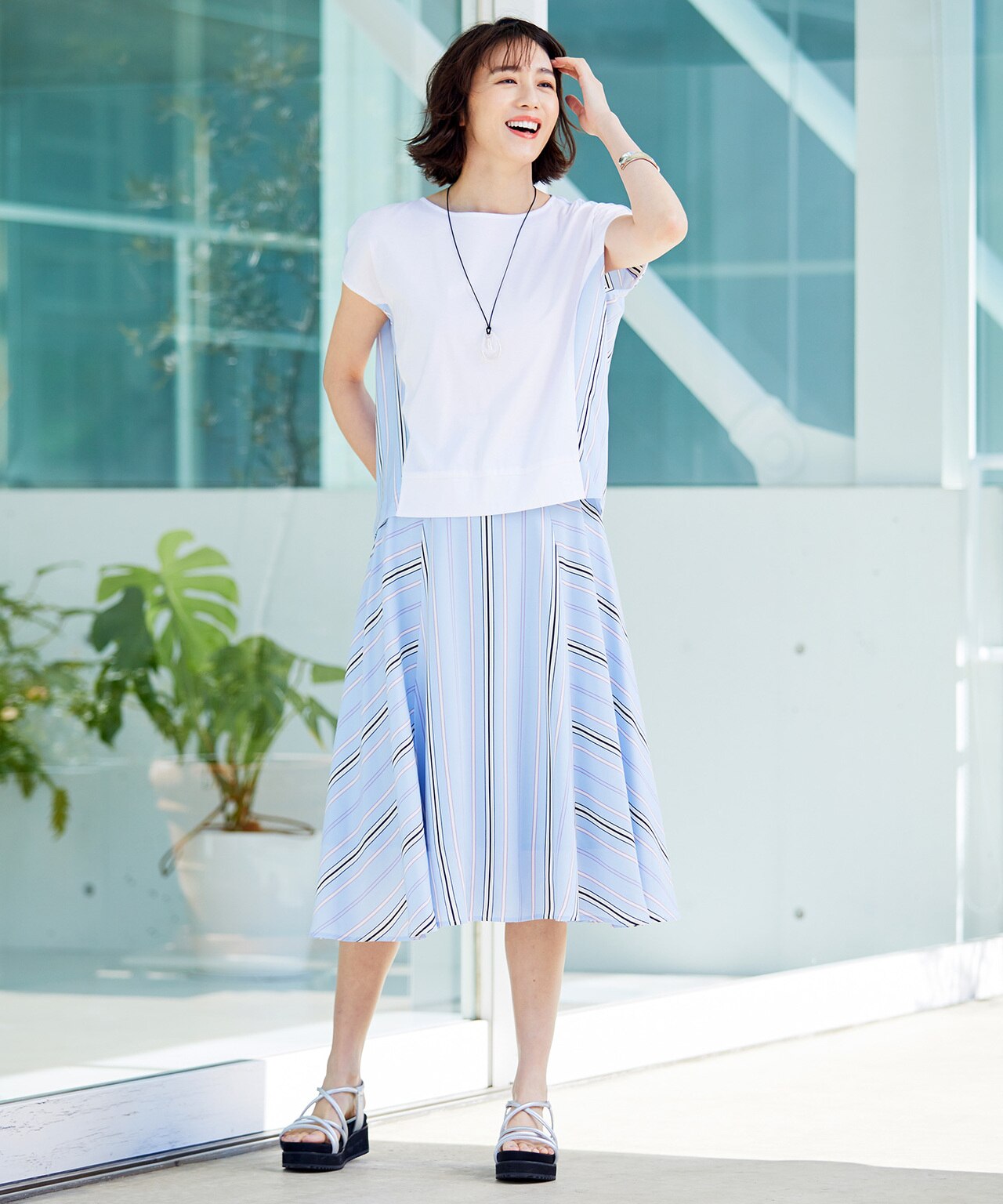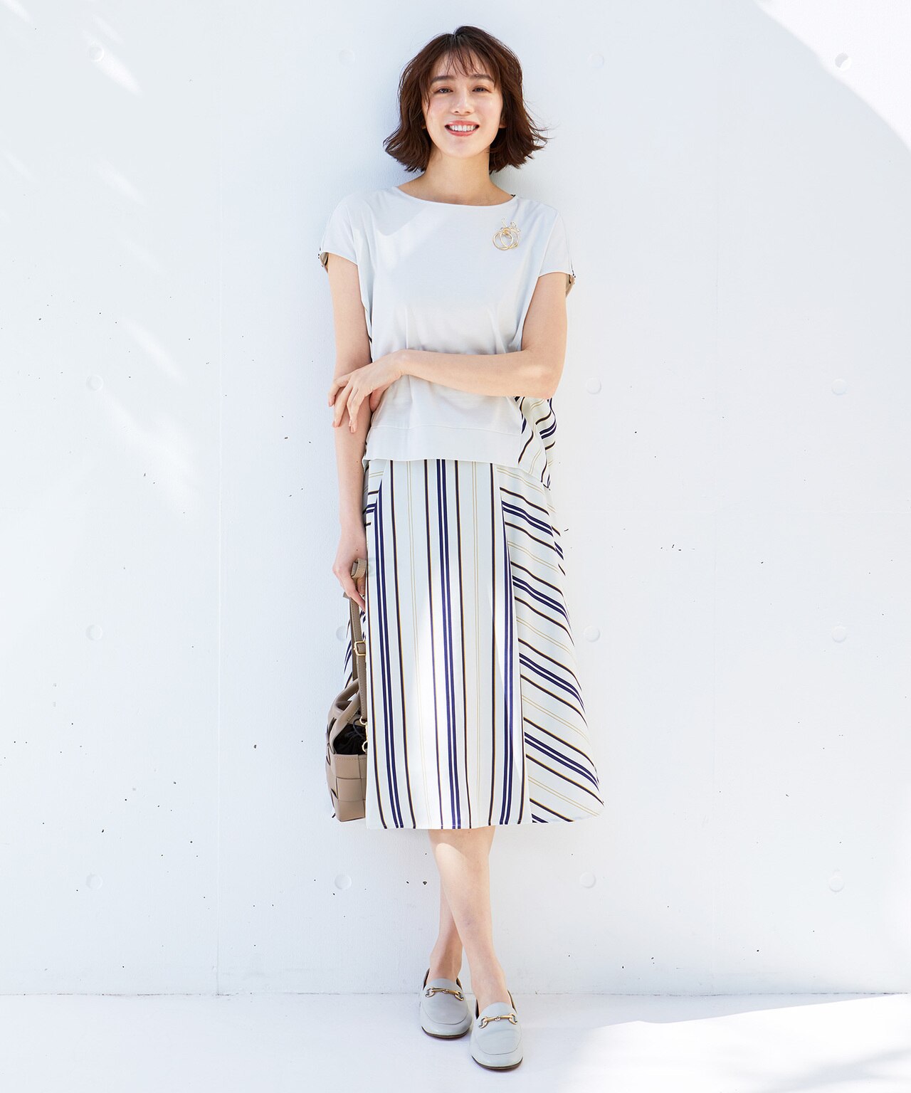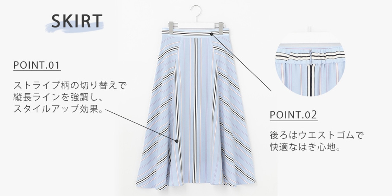 コーディネートのアクセントになるストライプ柄スカート。ロゴTシャツに合わせたカジュアルスタイルを華やかに彩ります。サイドの切り替えのおかげでスタイルアップ効果も。