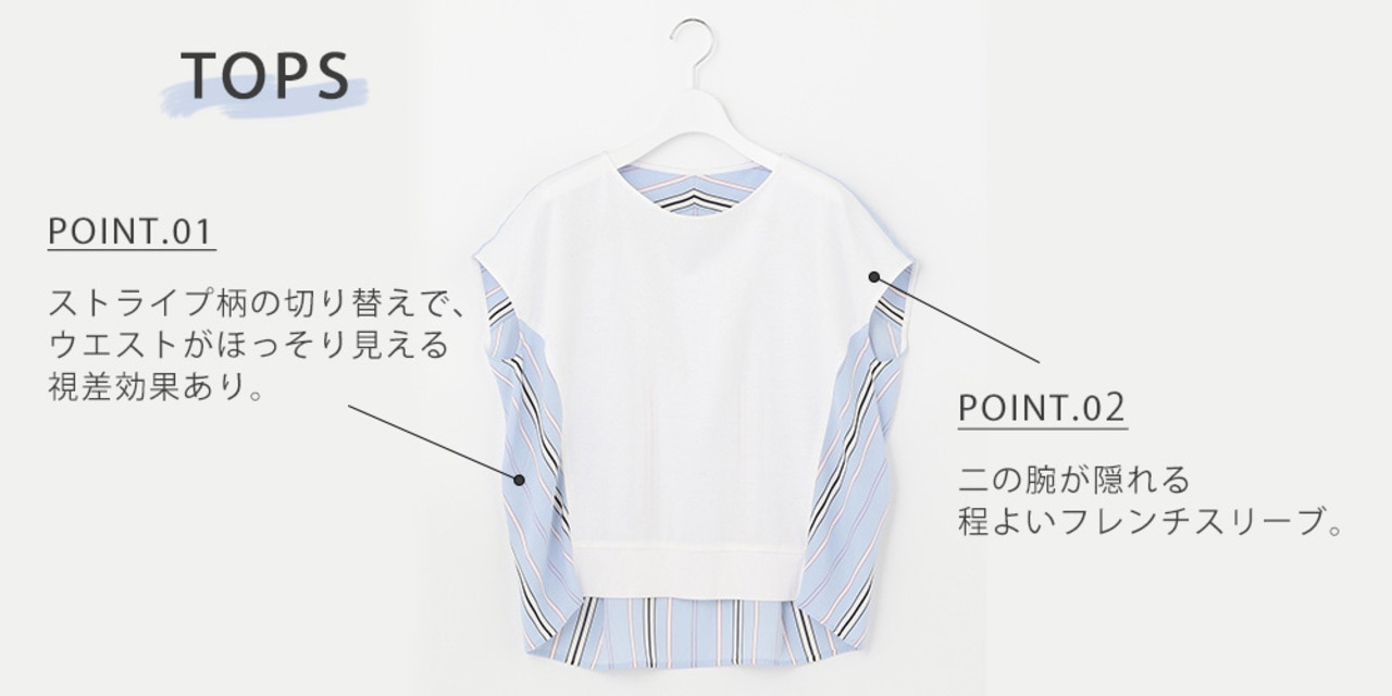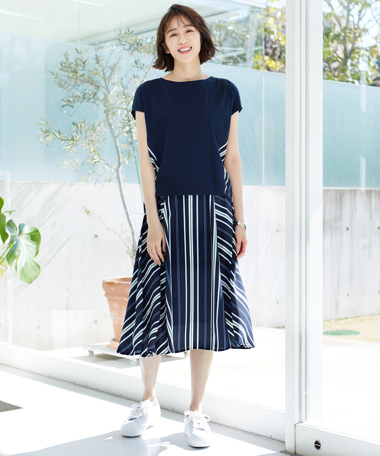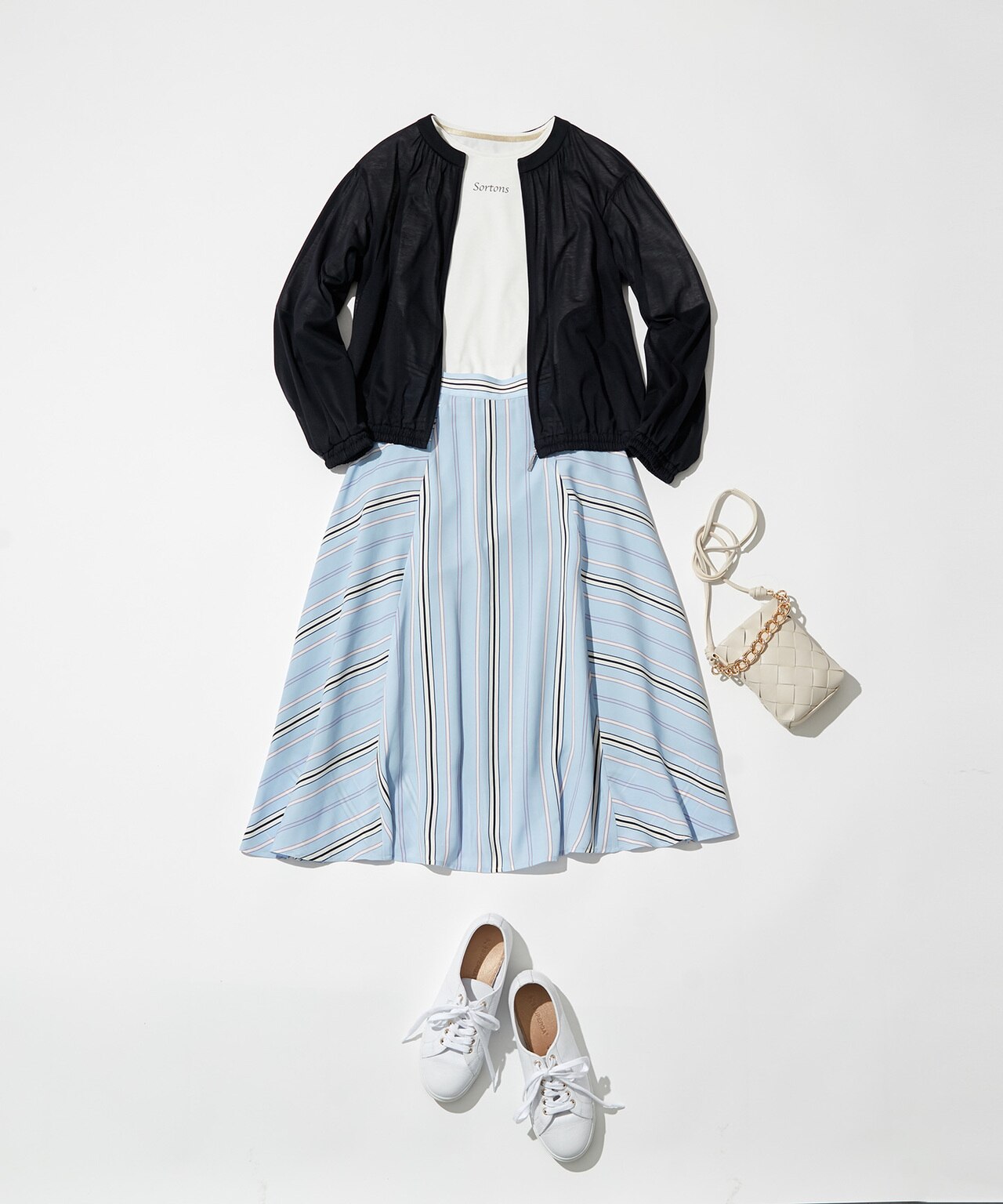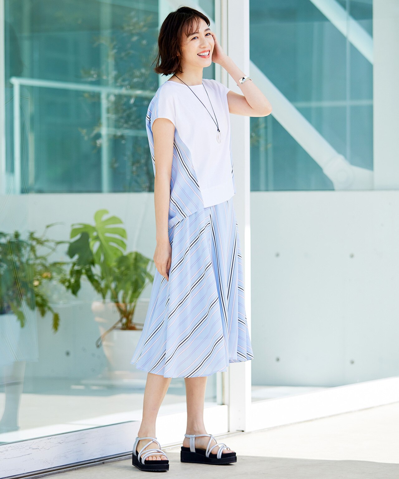 コーディネートのアクセントになるストライプ柄スカート。ロゴTシャツに合わせたカジュアルスタイルを華やかに彩ります。サイドの切り替えのおかげでスタイルアップ効果も。