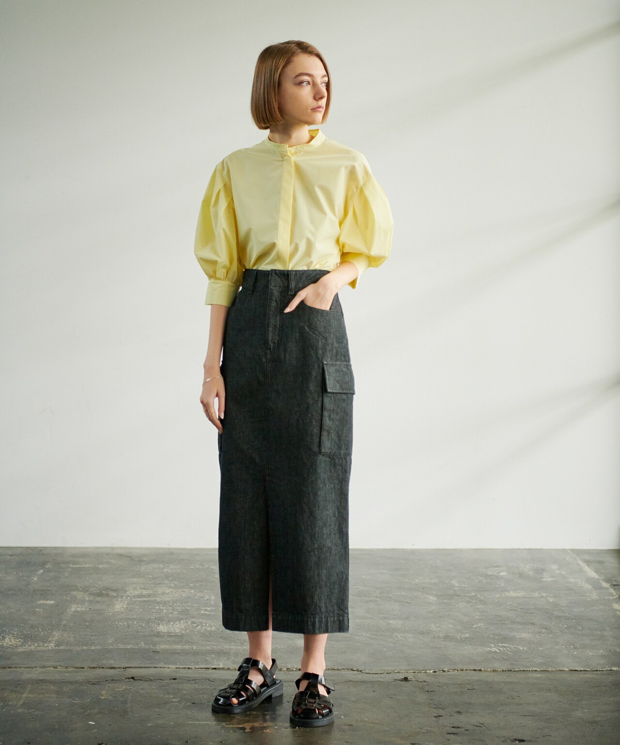 とびきり甘いブラウスもミリタリーディティールを加えたタイトスカートを合わせ、すっきり大人の表情に。タイトスカートが張り切りすぎて見えないのはデニム素材のおかげ。デニム スカートデニム スカートuncrave¥17,930(税込)→¥8,910(税込)