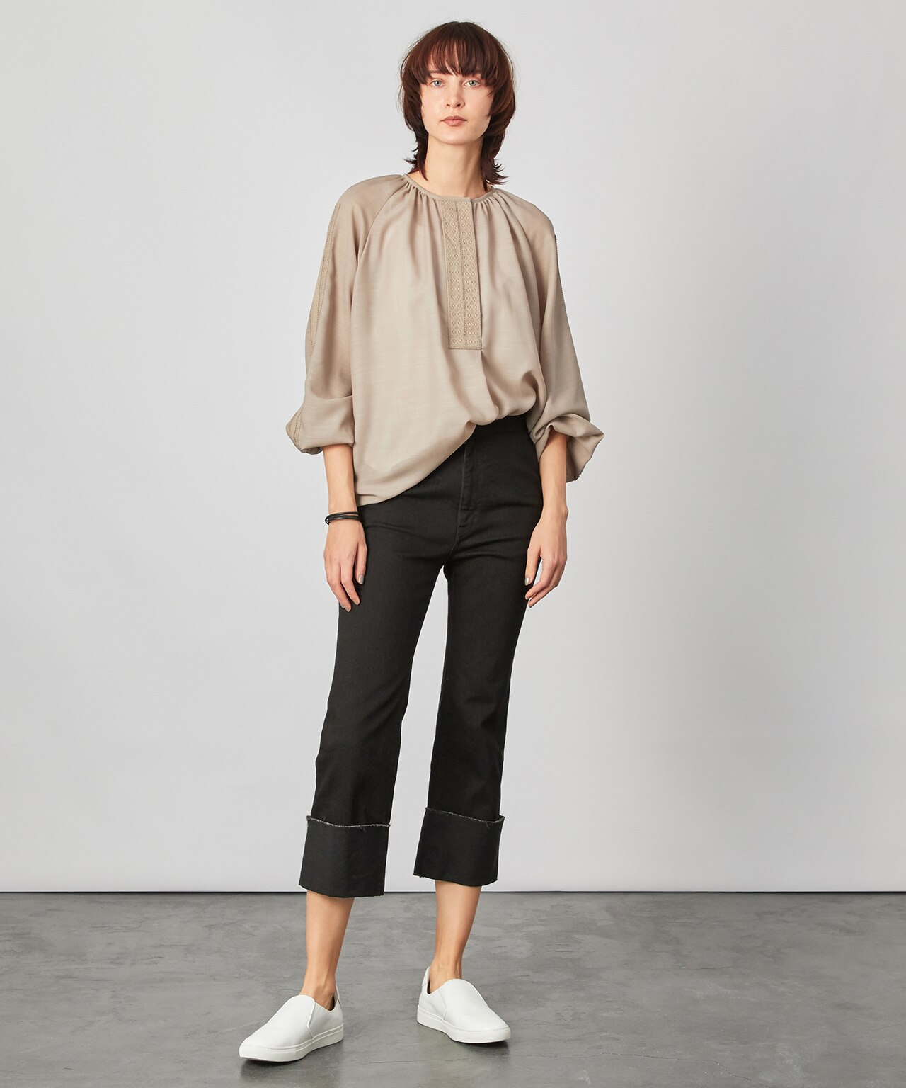 少し変化球のロールアップタイプも新鮮!ボリュームのある裾から除く足首がキュッと締まった印象に。後ろポケットはフェイクレザーでキリリと締まる辛口モードなデニム。PONS / デニムパンツPONS / デニムパンツBEIGE,¥29,700(税込)→¥8,910(税込) -