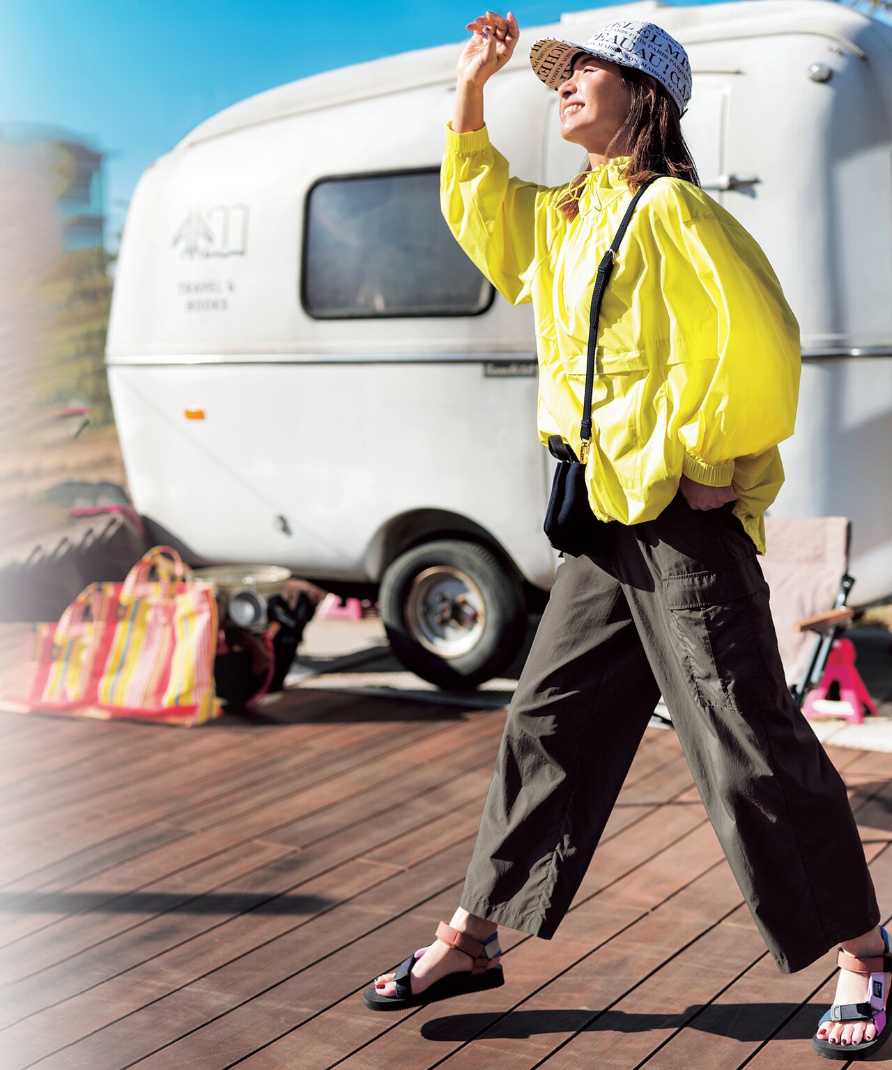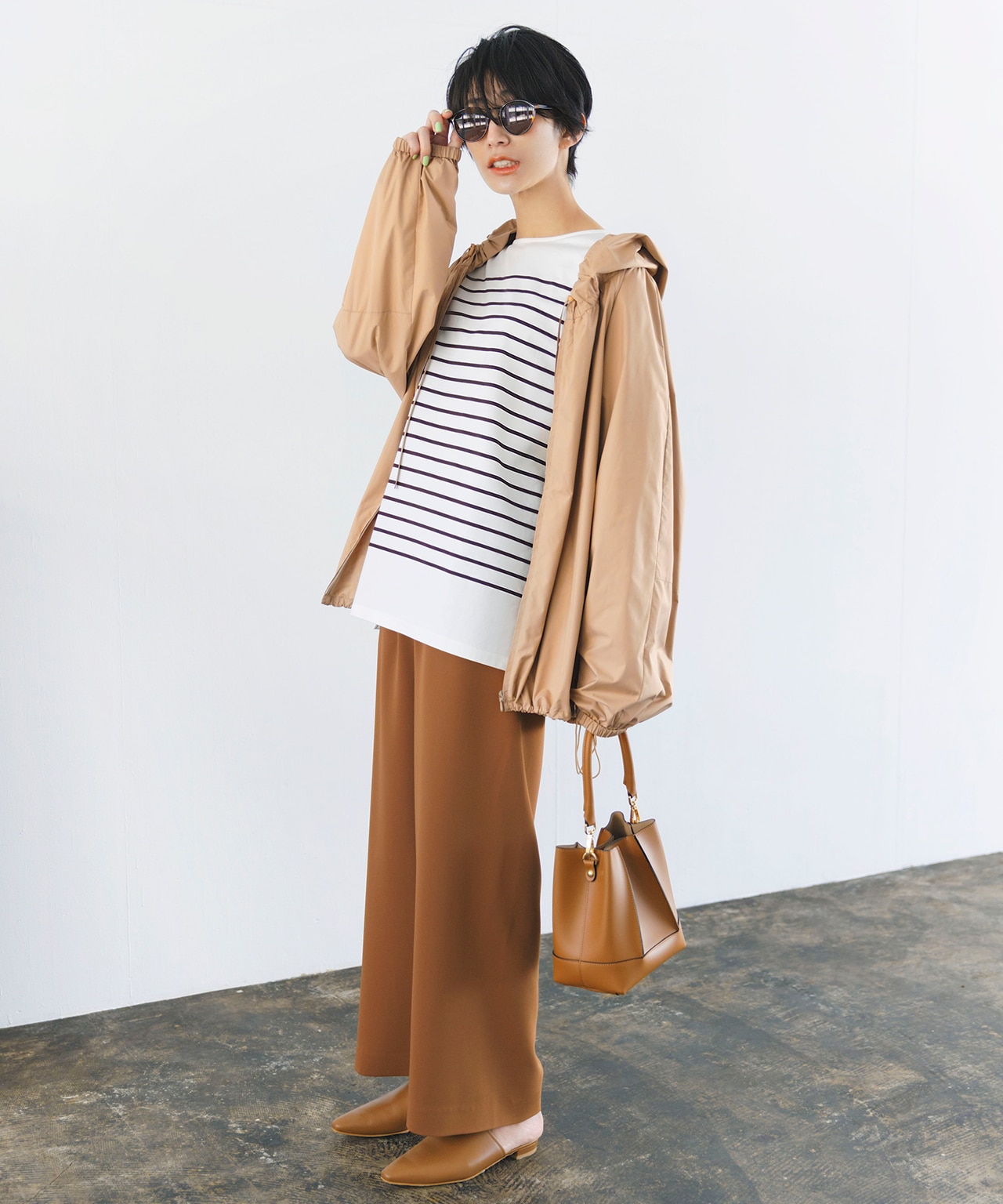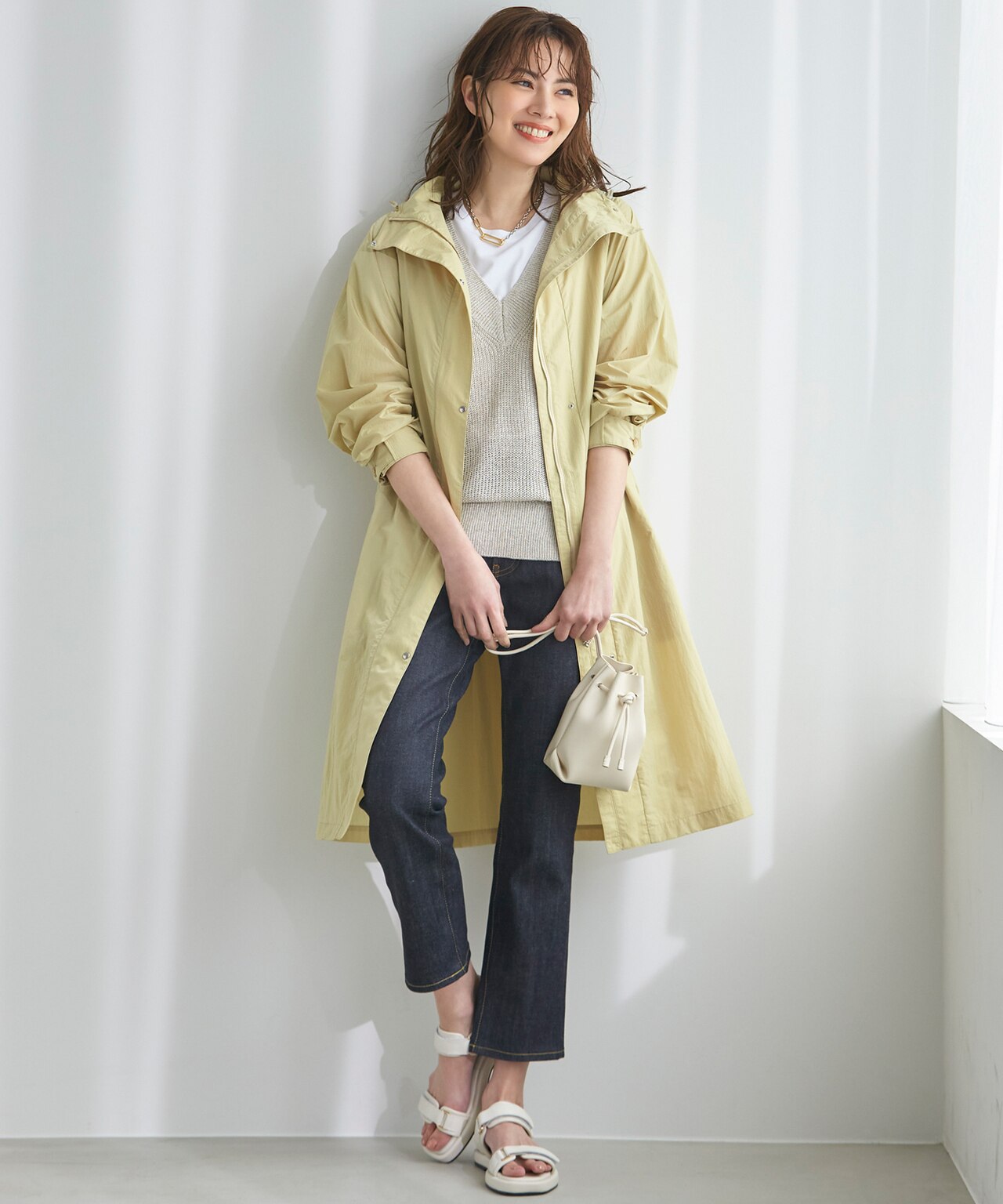 ウエストのドロストコードをキュッと絞ると、メリハリのあるシルエットに印象チェンジ。コーデに馴染む、暖かくて優しいイエローは、ベージュのような感覚で使えておしゃれ見えが叶う。