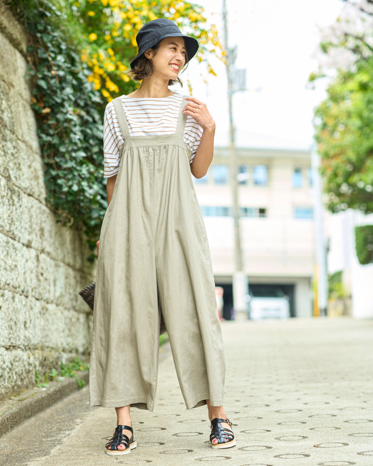 ボーダーTシャツとサロペットはベージュのワントーンにすることで旬な印象に様変わり。涼しいリネン素材のサロペットは、しっかり体型カバーも叶う優れもの。洗練された大人カジュアルなコーデで公園やお散歩に出かけてみませんか?