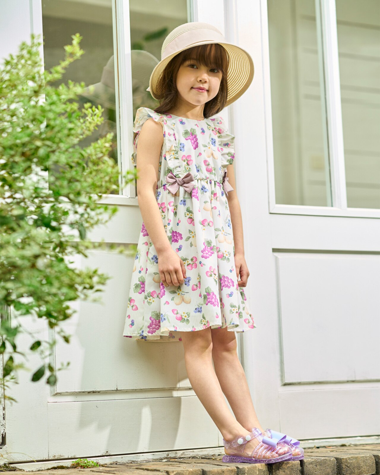 みんな大好きなフルーツ柄のワンピースは、大人顔負けの洗練された一枚。肩のフリルとウエストのリボンがポイントになって、華やかさを演出してくれます。ポケットもついているので、通園通学にも使えます。