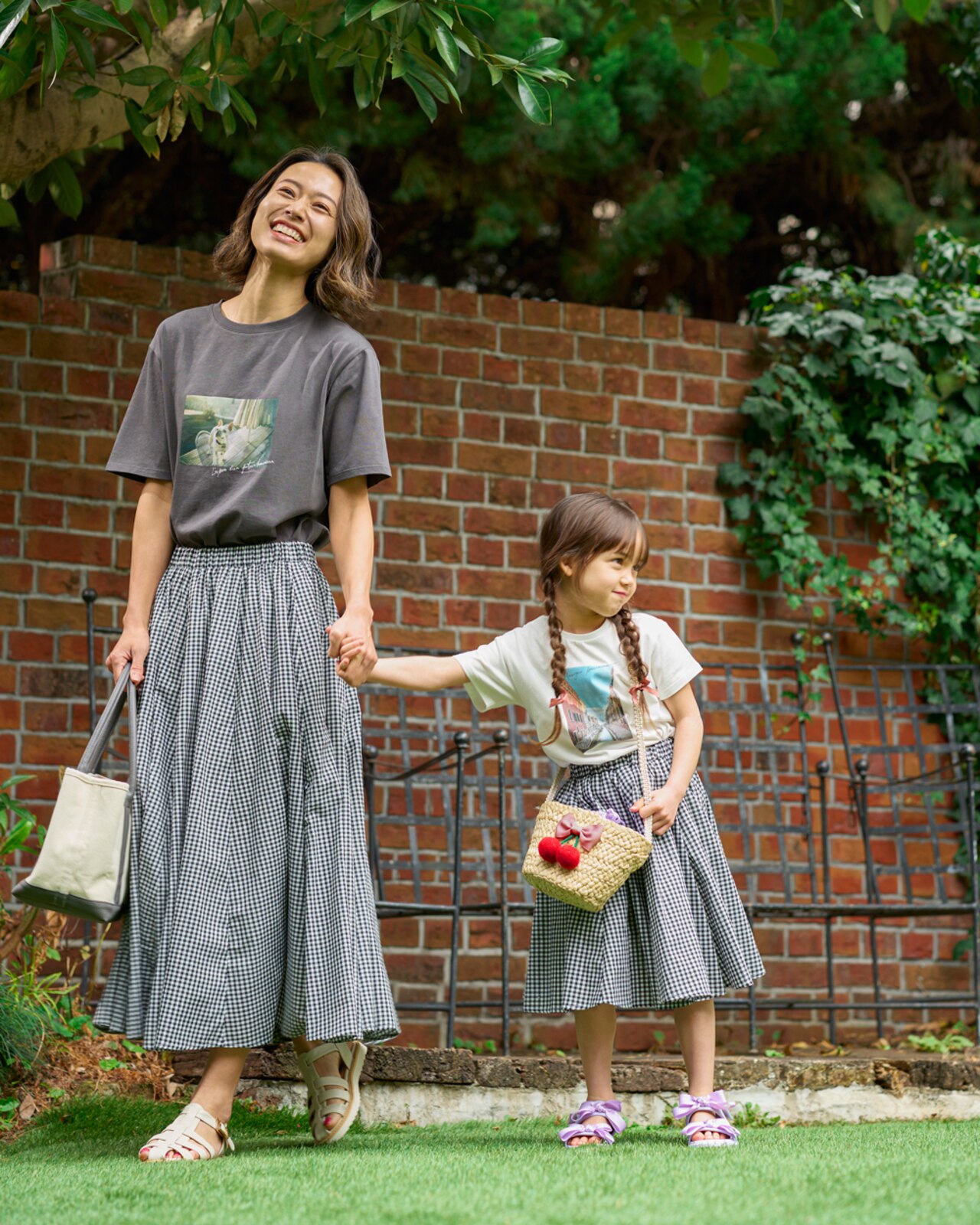 お揃いのボトムスを選べば、親子コーデも違和感なく決まります。フォトTは、ふんわりとしたボリュームのあるスカートと合わせることで、フェミニンな仕上がりに。ママとお揃いでお子さんも笑顔がたえないおでかけができるでしょう!