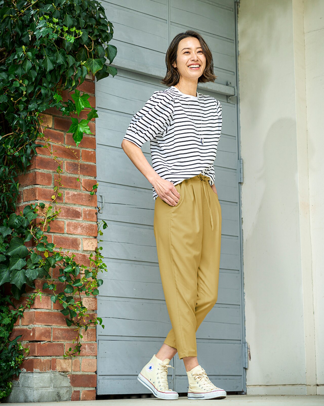 夏に映える細めのボーダーTシャツは、カジュアルすぎる印象になりがち。そこで登場するのが流行りのカラーパンツ。カラーものは、ボトムなら誰しもが取り入れやすく、ボーダーを上品な印象に導いてくれます。