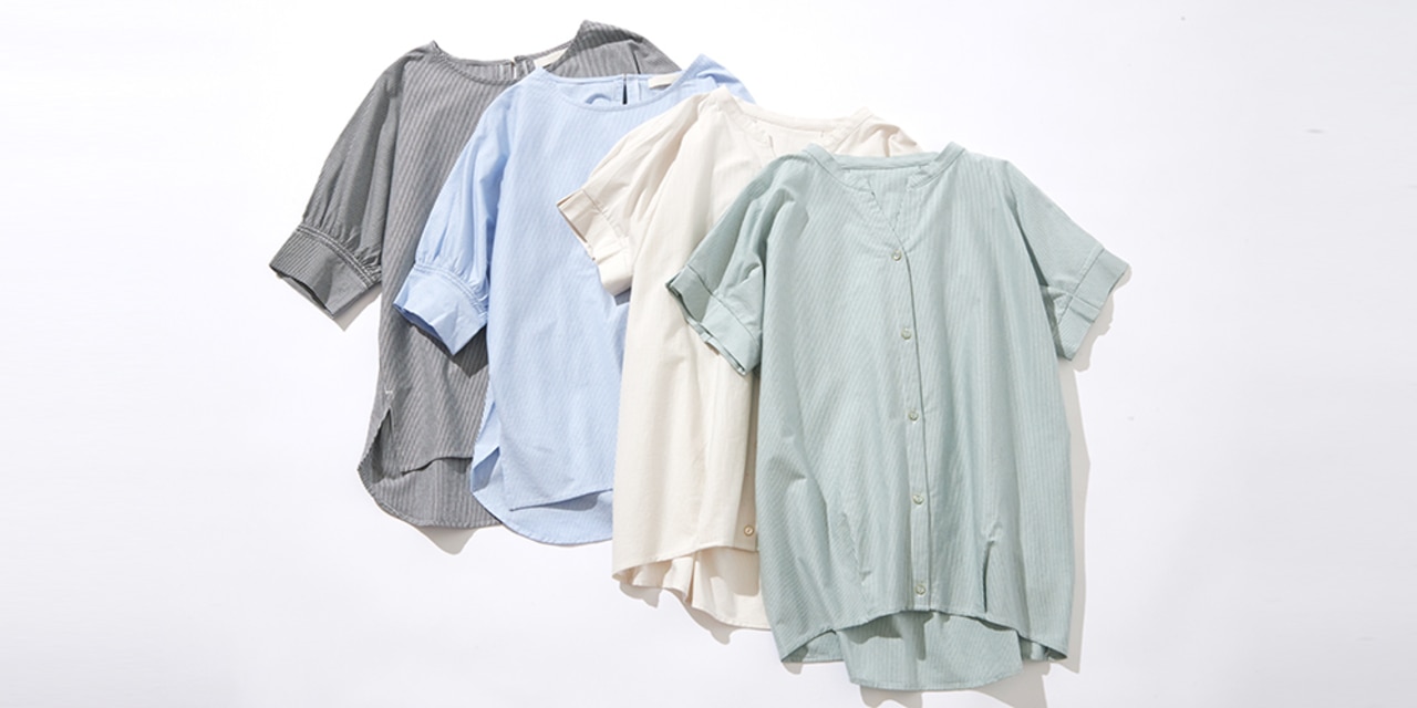 シャープな印象のスキッパータイプと、どんなアイテムにも合わせやすいクルーネックタイプの2型をご用意。無地のような見え感の細かいストライプ柄なので、春夏にぴったりな爽やかなコーデに仕上がります。