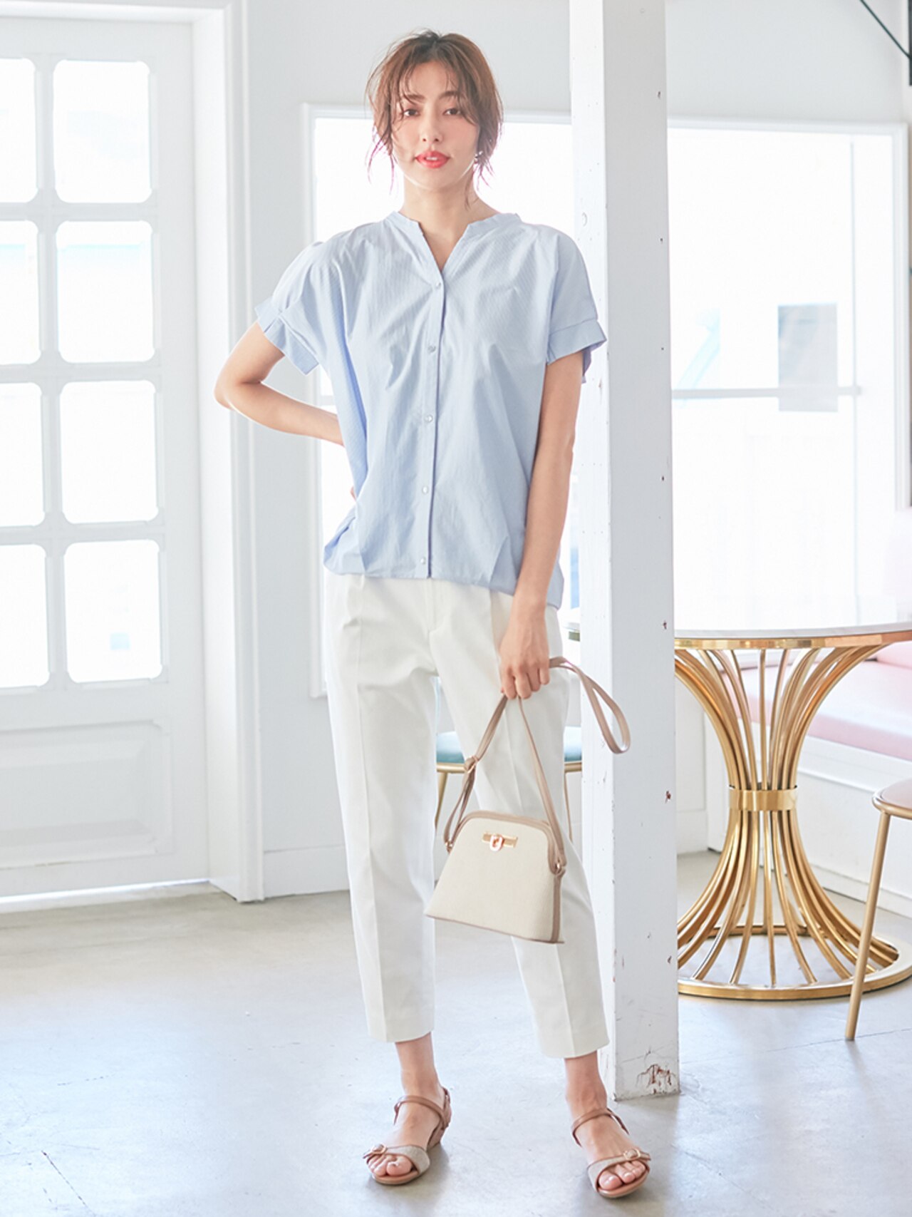 オフィスにもおすすめ。ブルーストライプが涼し気な爽やかコーデ