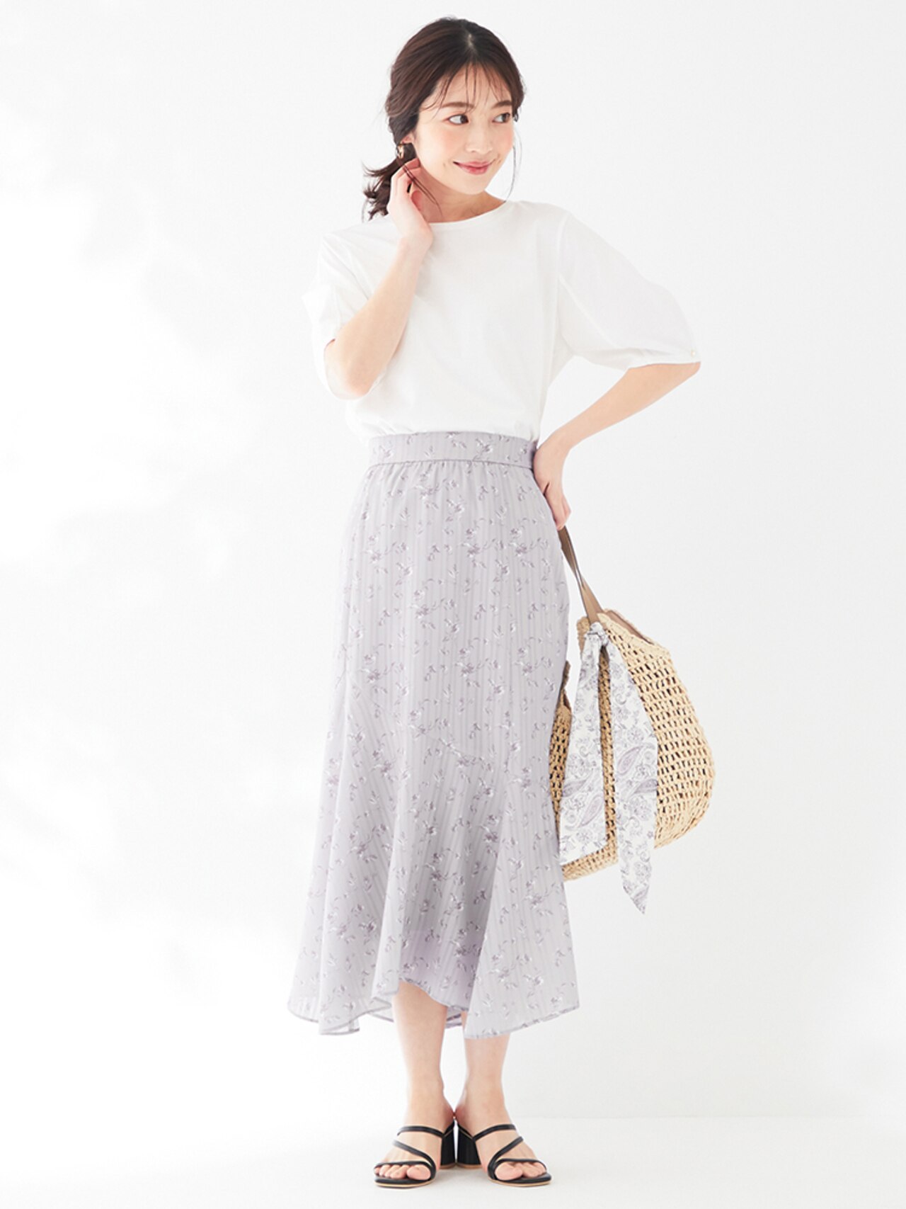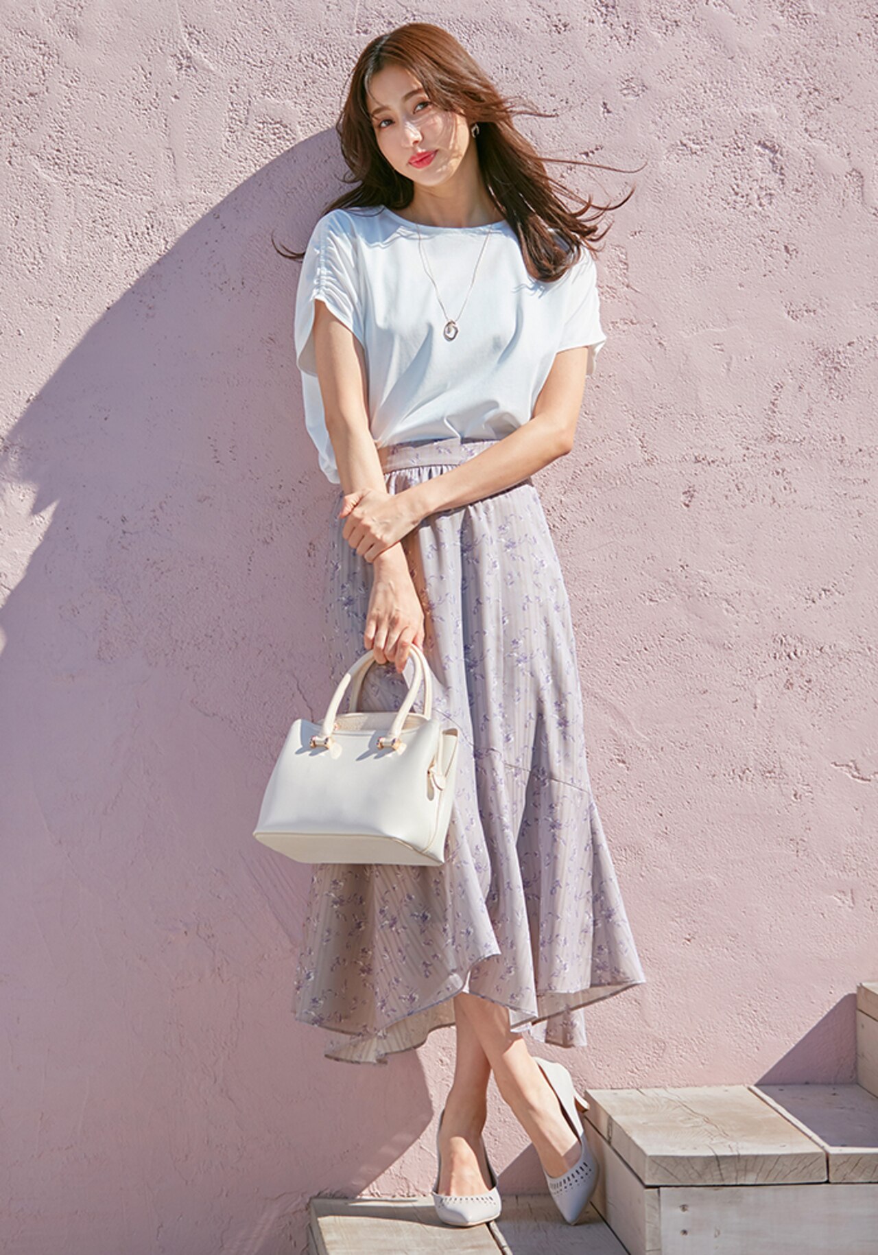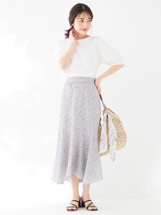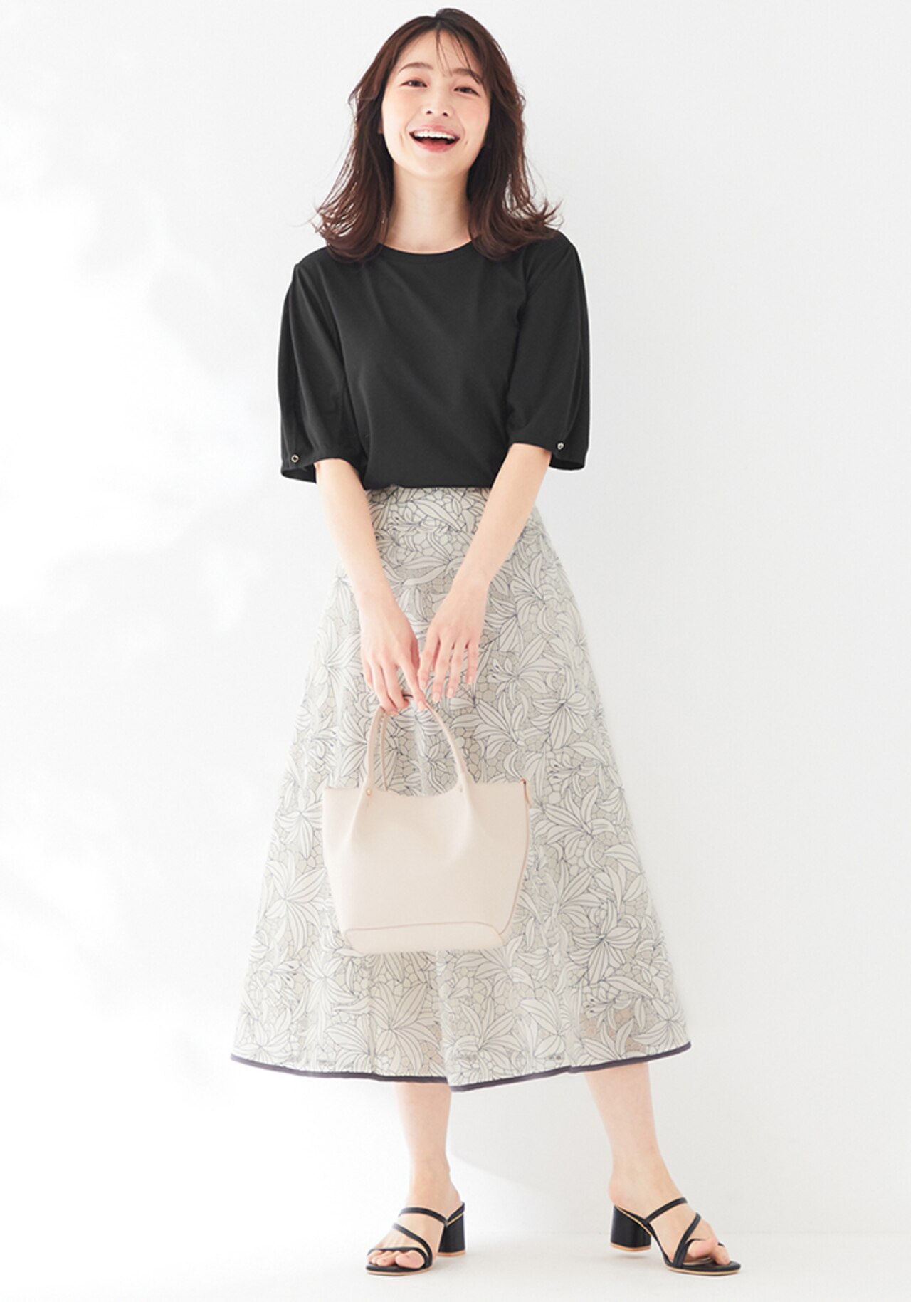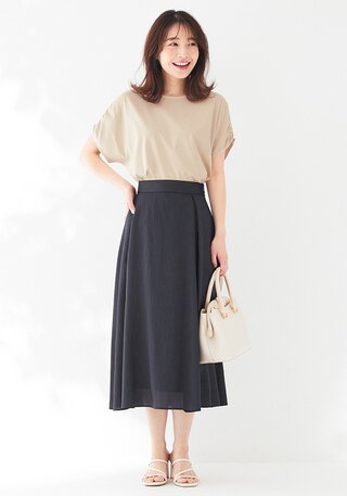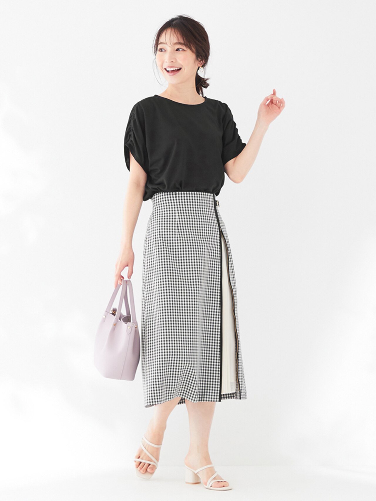 ゆったりとしたシルエットとギャザーの入ったフレンチスリーブはボディラインを拾いにくく、女性らしい華奢な印象に。