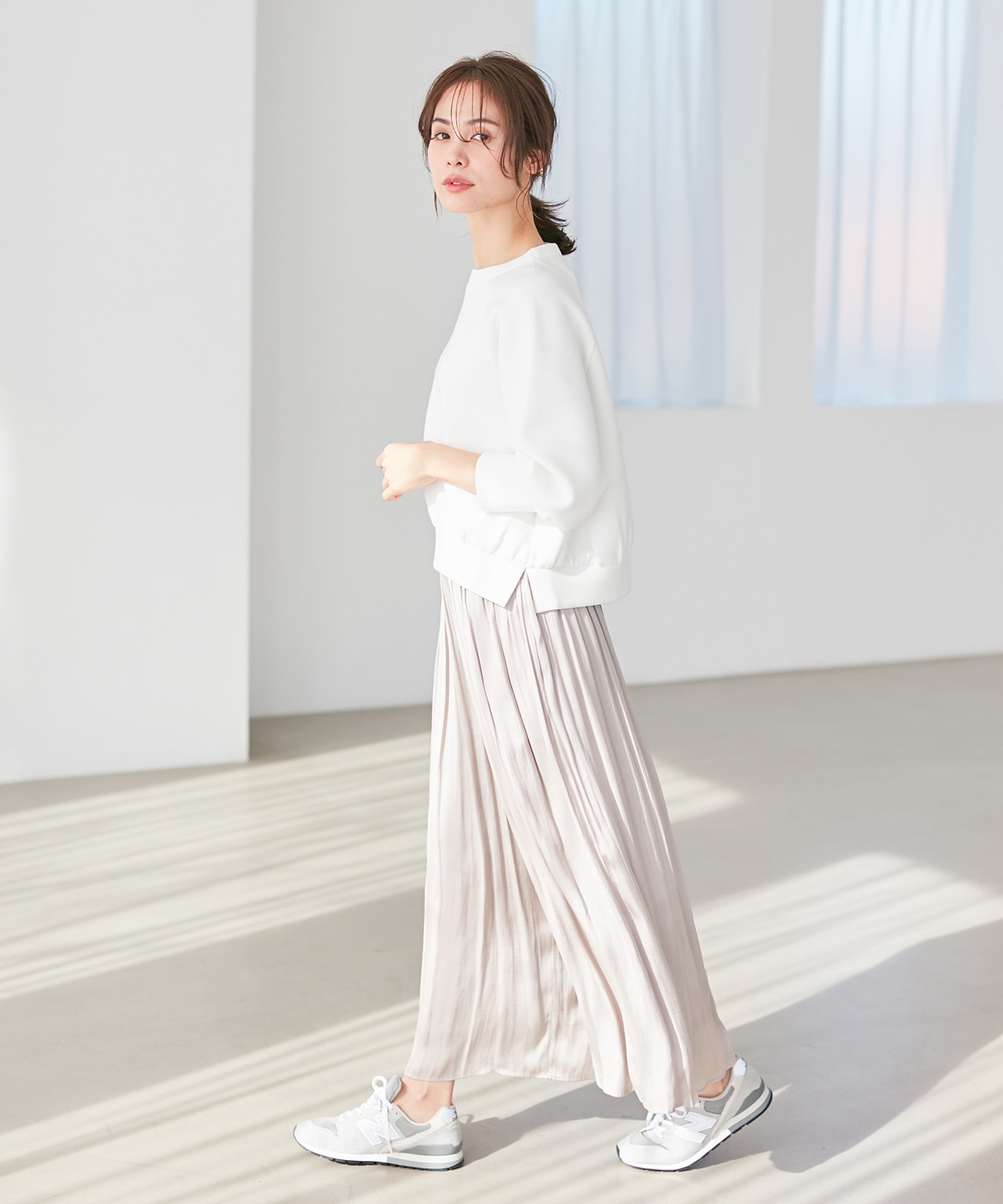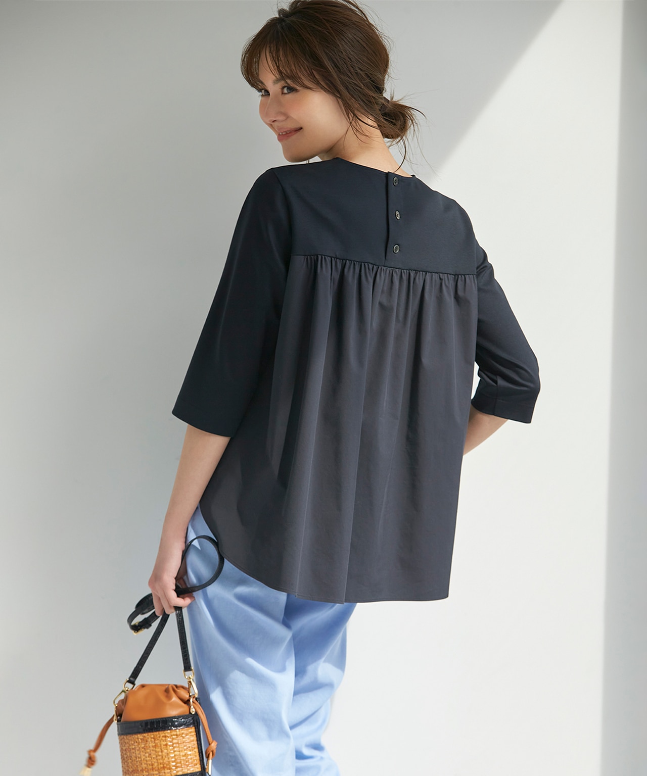 1枚でおしゃれが整う人気のカットソー!前から見るとシンプルなプルオーバー。背中はギャザーが程よくふんわり揺れるブラウス素材の切り替えに。たくさん着て欲しいからベーシックな色バリエを揃え、パンツ・スカートどちらでもバランスが取りやすいよう横のスリットを深めに入れることで、ボトムスインもアウトも決まるような黄金バランスに。仕事シーンにも丁度良い可愛さです。