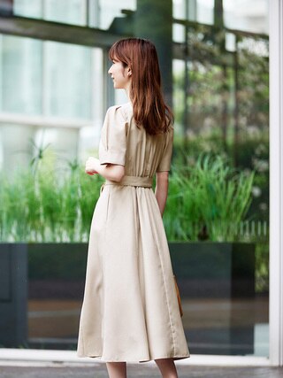 目線を上げる工夫の一つが、付属のベルトをとめる位置に。ウエストよりも少し上にすることで腰位置が高く、さらにスカーフの効果でぐっと目線があがりスタイルアップ! -