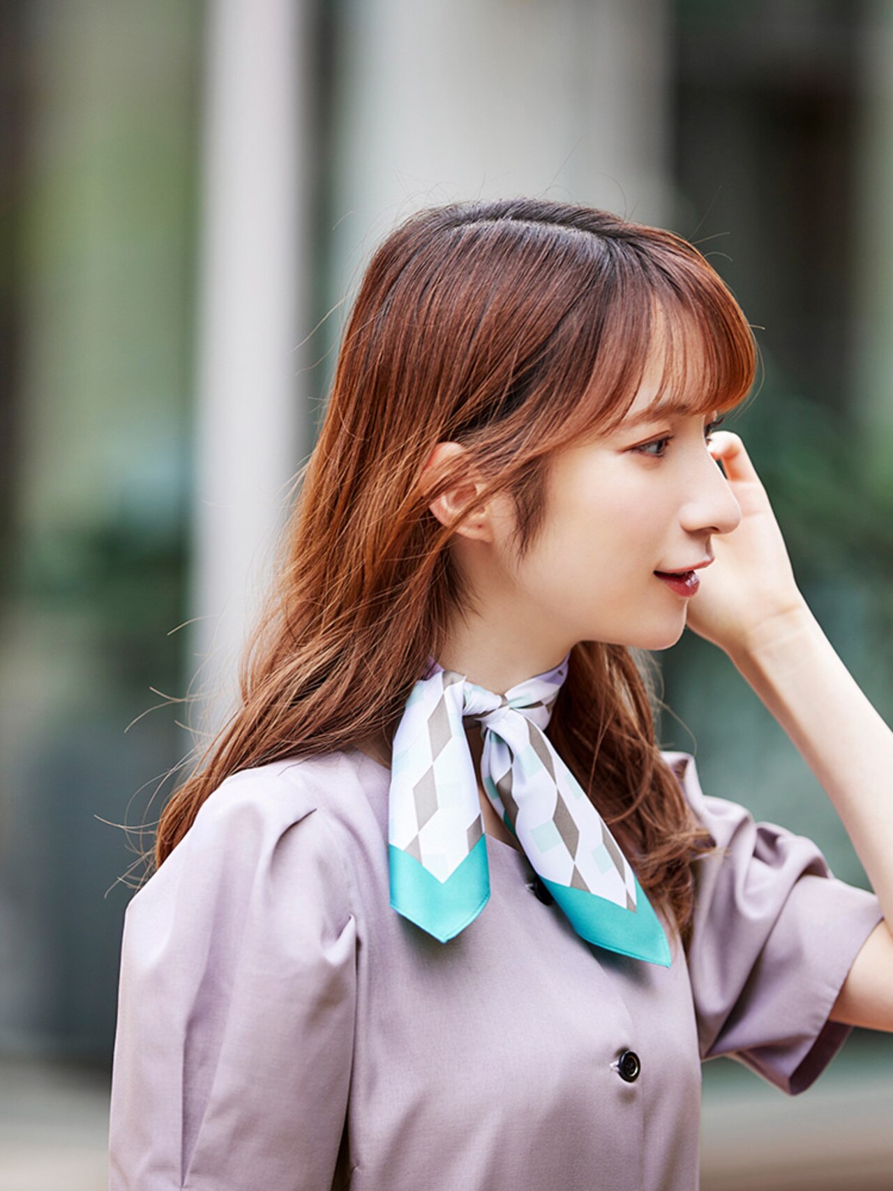 首が長いウェーブさんは顔回りを華やかにするのがポイント!お洋服のトーンに合わせたスカーフをきゅっと結んでアクセントに。大判で垂れ下がるものよりも、小さめのものがおすすめ。
