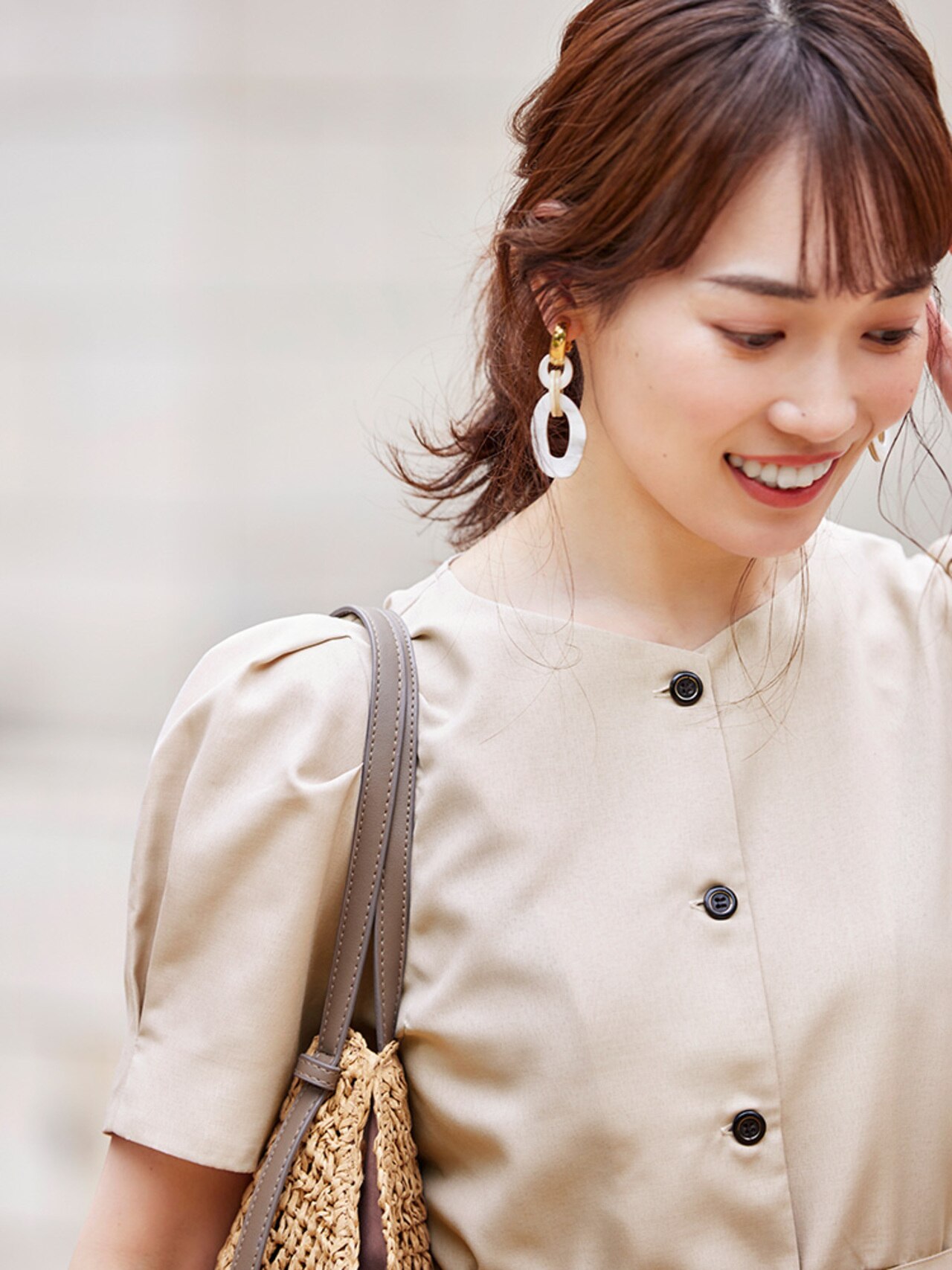 ウェーブさんは首が長い人が多くて、少し下重心に見えがち。上の方にポイントを置いて目線を上げる工夫があるとバランスよく見えます。バッグは薄くて華奢なものや、小ぶりなものを選んであまりアクセントにならないようにワントーンに仕上げるのもコツ!