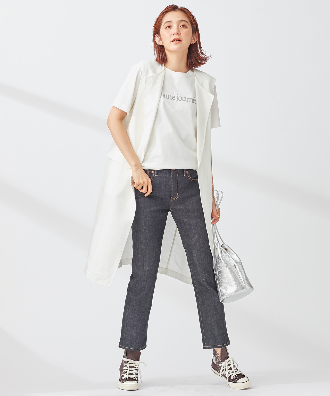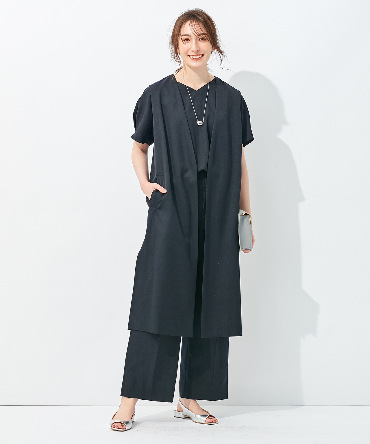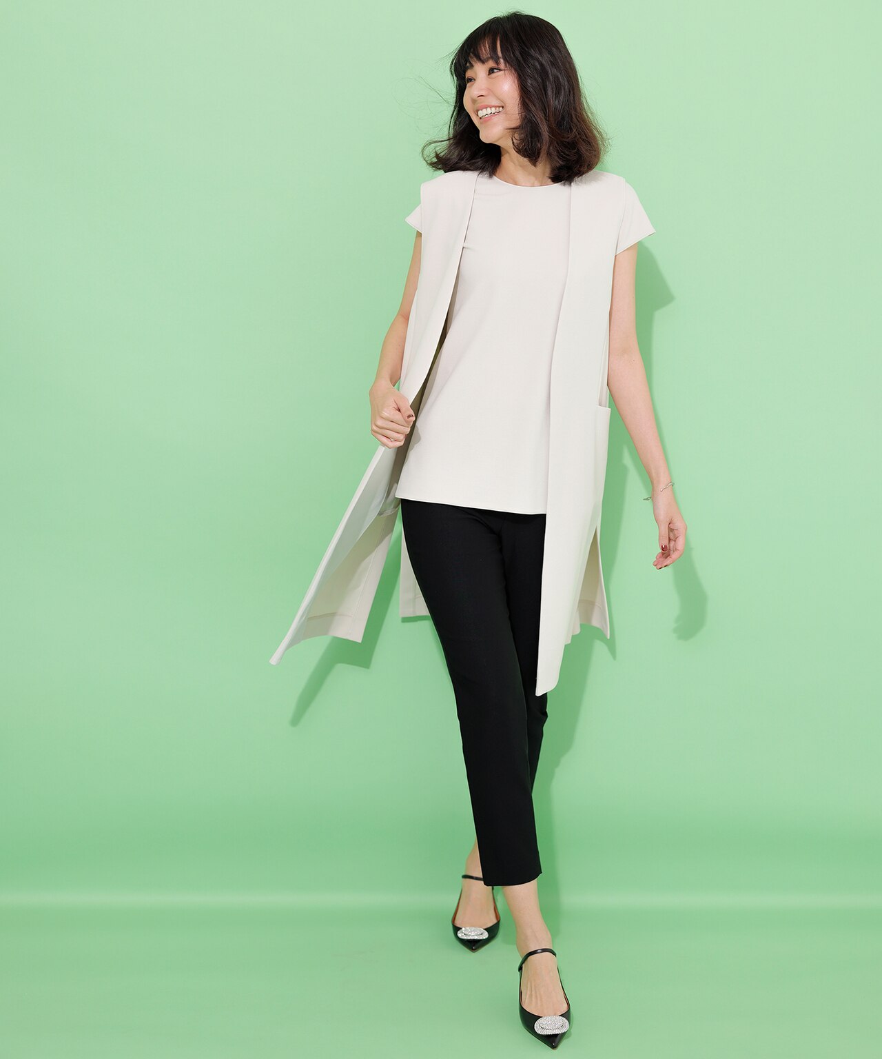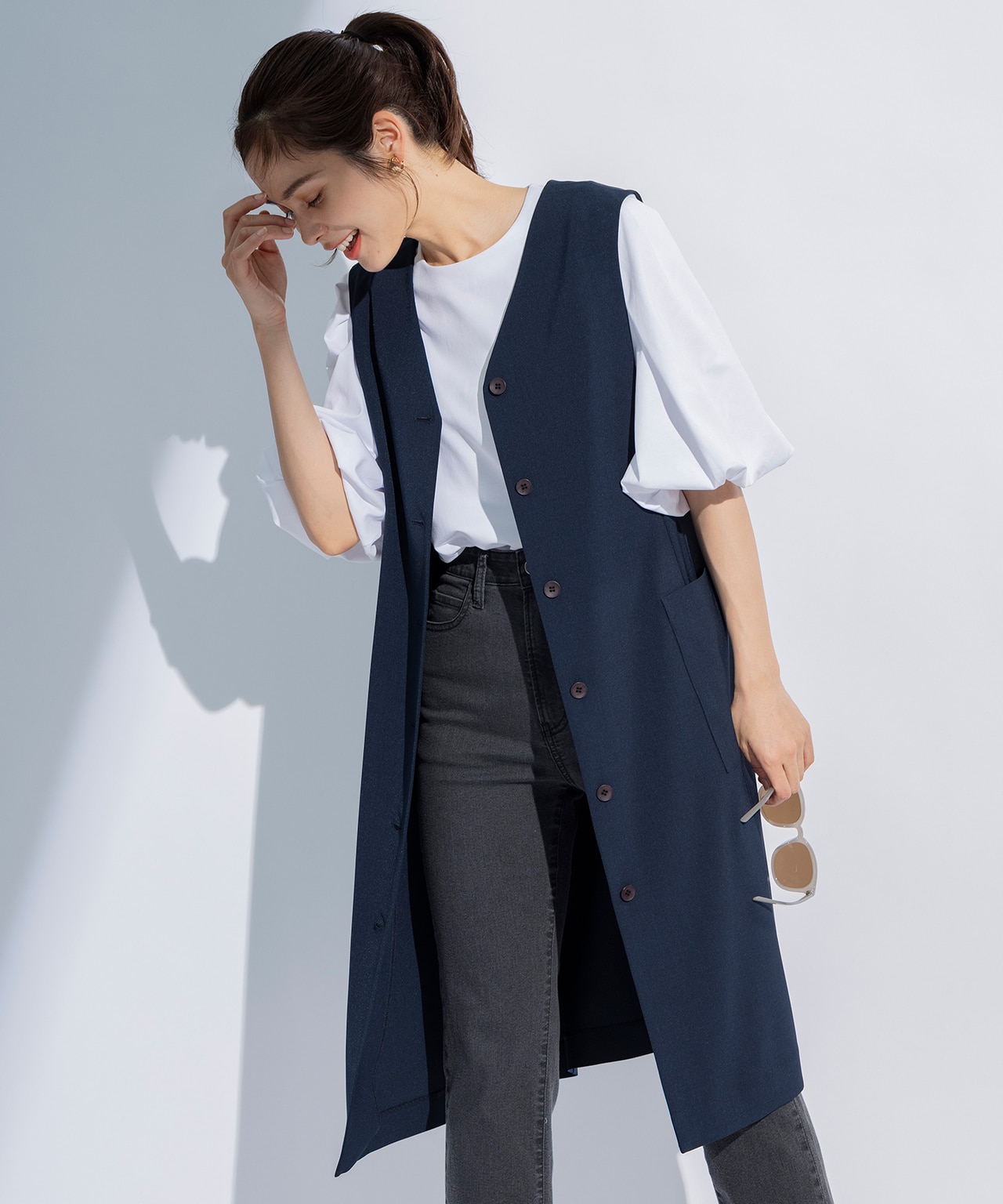 Tシャツ&パンツの手抜き感を、一瞬で格上げするジレマジック!ふともも周りまでしっかり隠してくれるので細身のパンツでも安心。綿のTシャツを高見えさせるジョーゼット素材やリネン混素材を選んで、頑張らずに洒落感UP!