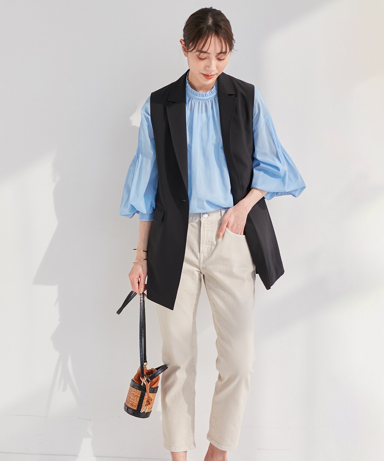 今年旬の盛袖ブラウスを投入すれば、二の腕カバーと旬見えを両立!春に大活躍したブラウスなんかもこうやってジレと合わせれば、新鮮な気持ちでまたワンシーズン楽しめそう。袖を甘くしたらボトムはパンツで締めるのがおすすめ。