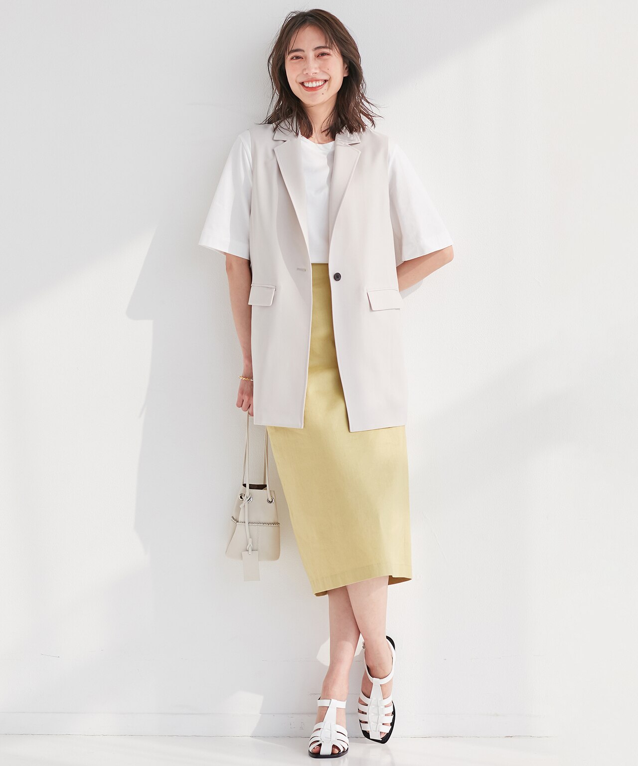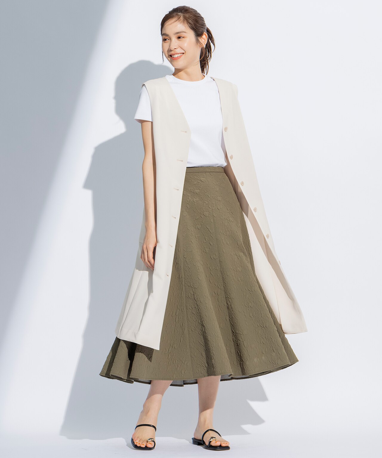 スカート合わせも問題なし!ジレの裾からスカートの丈が見えるバランスが◎。メリハリがなくならないように、ベルトでウエストを締めるか、トップスとスカートの境目が分かりやすいように上下の色差が出るように着るのもおすすめ。