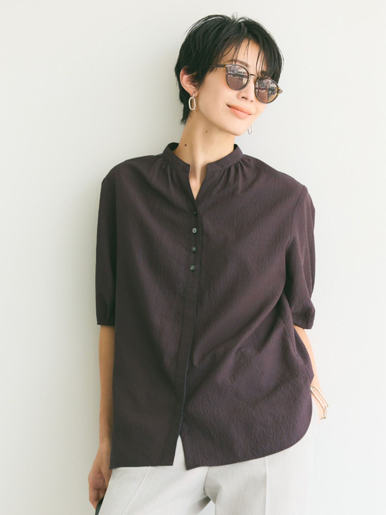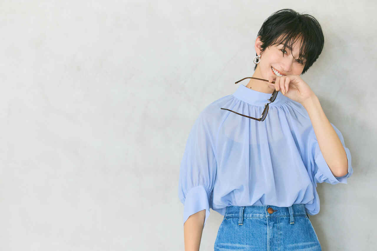袖元ディティールのトレンドが続いた中、次に注目すべきは首元のアクセントデザイン。ギャザーたっぷりのスタンドカラーが目を引くブラウスは、カラーとシア―感で定番デニムも新しい見え感に更新。