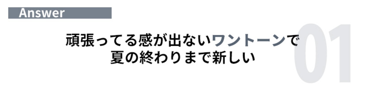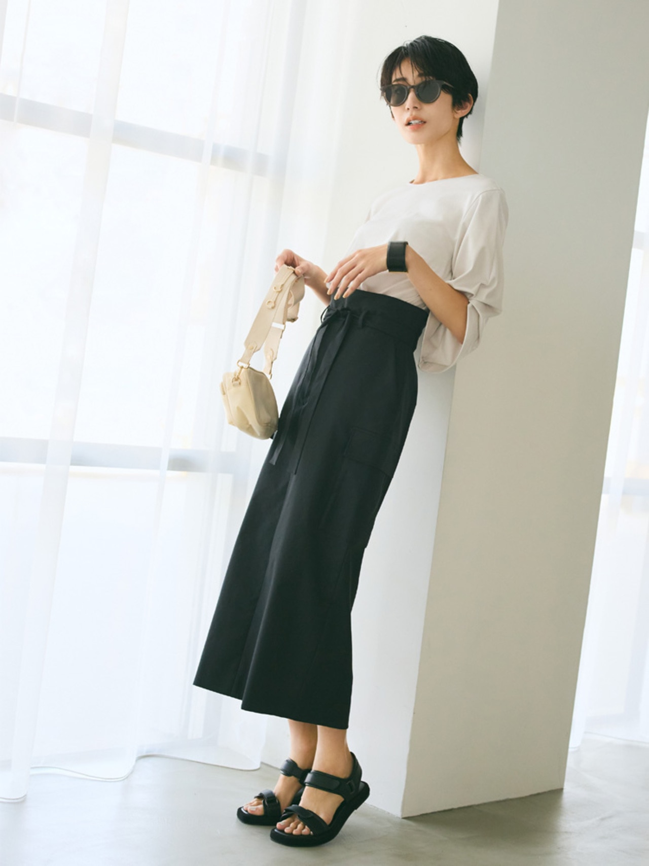 ついつい手抜きになりがちなモノトーンスタイル。回避への道は、1枚で成立するデザイントップスを選ぶこと。袖のディティールのさりげなさが大人も着られるデザインの秘密。五分袖を選べば肌寒くなる秋まで着られる万能ロングラン服に。