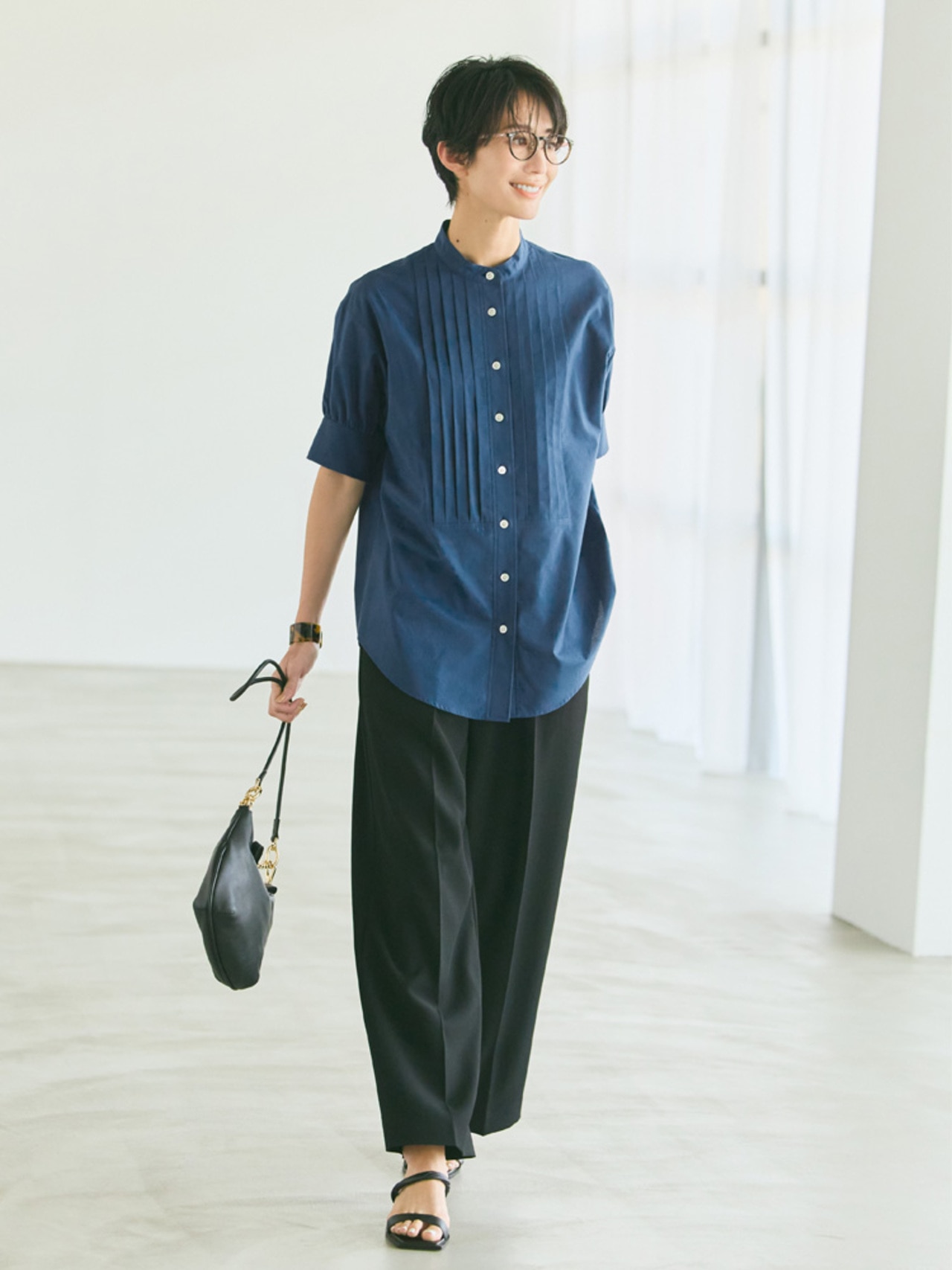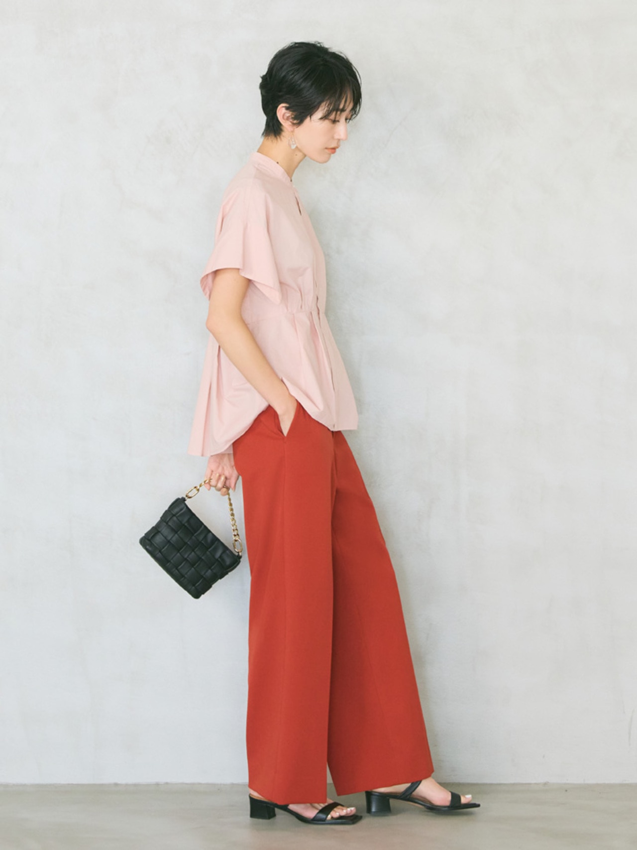 ウエストINして着こなすことが多かったトップス×ワイドパンツのスタイリングも、今季はシャツOUTであえてゆるっと着こなすことで見え感を更新。印象的なピンタックデザインがゆるシルエットも引き締めてくれる。