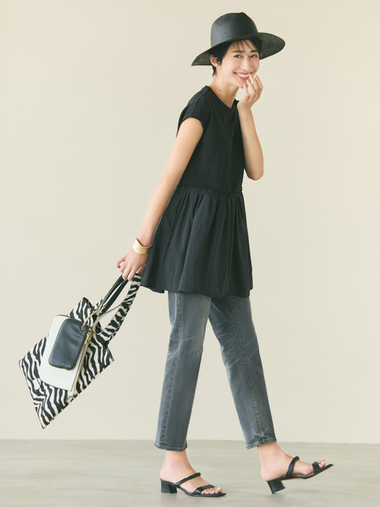 腕や足元に肌の露出が増える分、全身ブラックでも重たく見えないのが夏の利点。身近なアイテムのデニムを使えば、1トーンコーデのハードルも下がるのでオススメ。黒小物で統一して、よりシャープで都会的な仕上がりに。カットソーカットソーUNFILO¥9,990(税込)→¥2,996(税込)Lサイズパンツパンツ23区¥16,940(税込)Lサイズ / Sサイズトートバッグトートバッグ23区¥14,850(税込)→¥10,340(税込) -