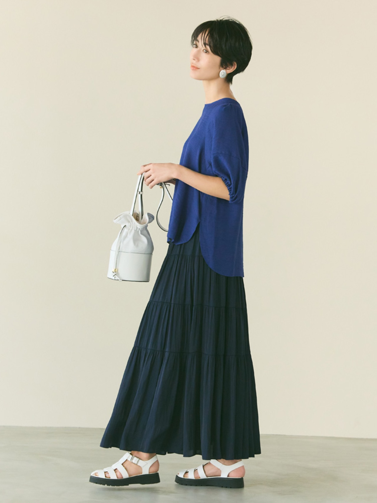 全身1トーンでなくても、色味を少しずらした同トーンコーディネートなら統一感があって◎。ブルー×ネイビーは甘いアイテムでもクールに着こなすことができる最良の組み合わせ。ホワイト小物で清涼感のあるスタイル。ブラウスブラウスUNFILO¥7,990(税込)→¥2,396(税込)Lサイズスカートスカート自由区¥19,910(税込)→¥13,860(税込)Lサイズ
