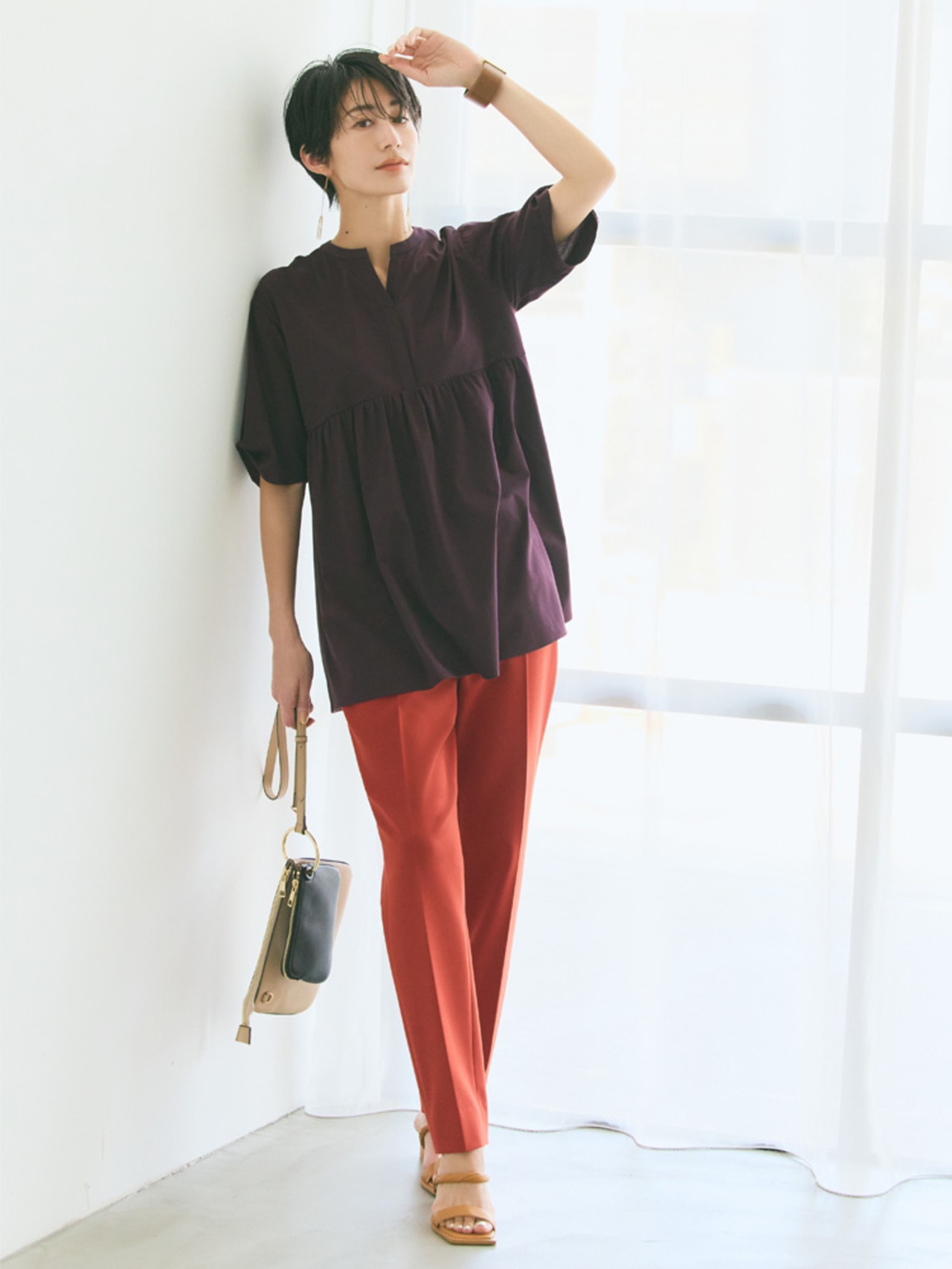 カラーパンツ×定番色アイテムの王道の組み合わせは、新たにパープルトップスの投入で新鮮なカラーコーディネートに。色×色の鮮やかさスタイルには、キャメルの小物でマイルドさをプラスして。カットソーカットソーJ.PRESS LADIES¥13,970(税込)→¥9,680(税込)Lサイズ / Sサイズパンツパンツ自由区¥16,940(税込)→¥8,470(税込)Lサイズバングルバングル23区¥9,900(税込)→¥4,950(税込)バッグバッグ23区¥14,850(税込)→¥10,340(税込) -