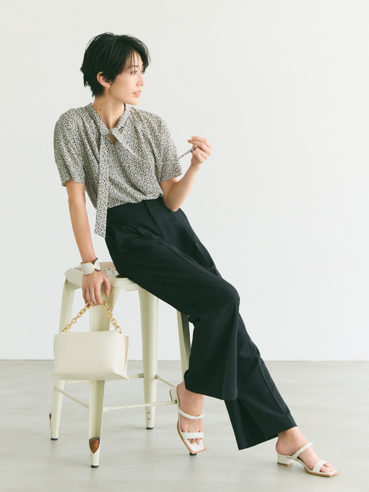単調になりがちなモノトーン合わせこそ、柄×ボウタイブラウス投入で新鮮かつシックな着こなしに。小物も白でカラーレスにまとめれば、マニッシュなワイドパンツスタイルに小粋さが加わる。
