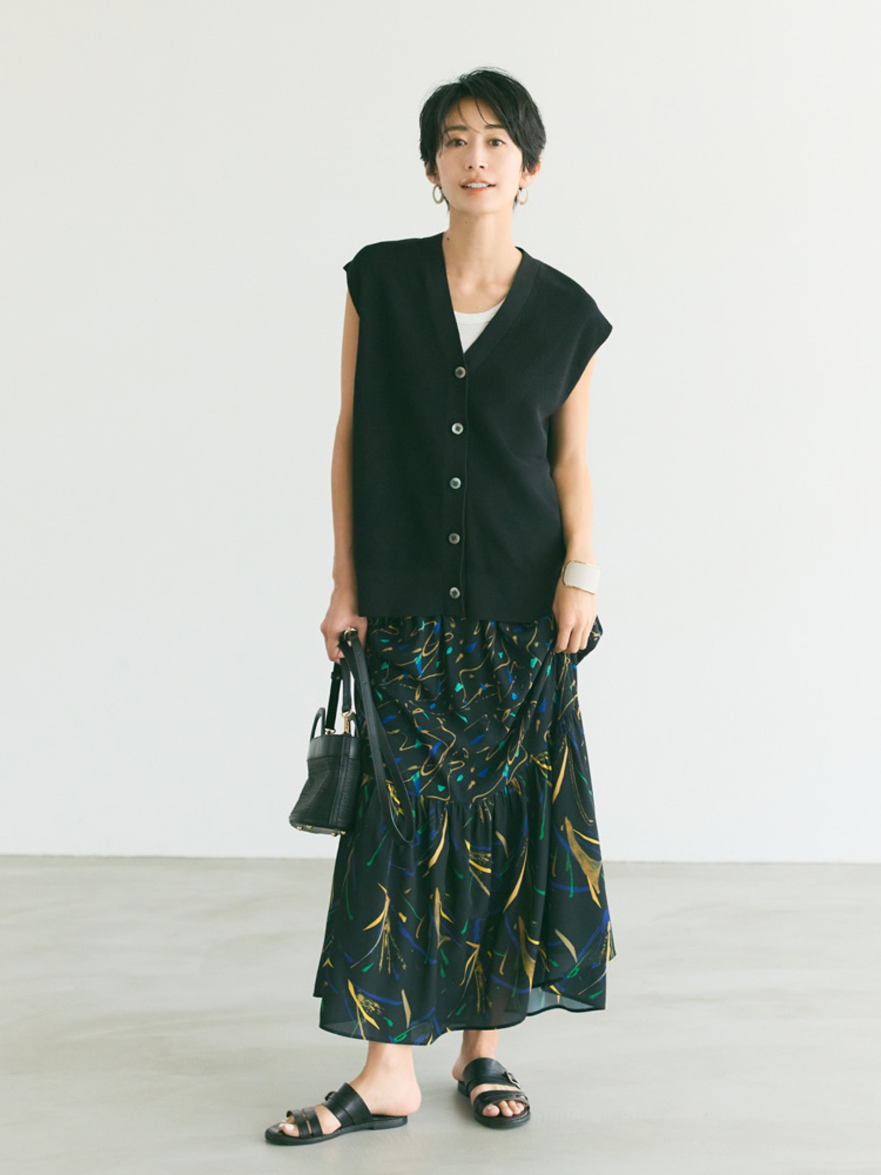 スタイリングは柄スカートから色を拾うのが配色コーデの鉄則。カラフルなペイント柄が映えるアーティスティックな柄スカートも、ベースの黒を活かせばいつものコーデに落とし込める。プラスワンで即新鮮になれる新顔ボトムス。
