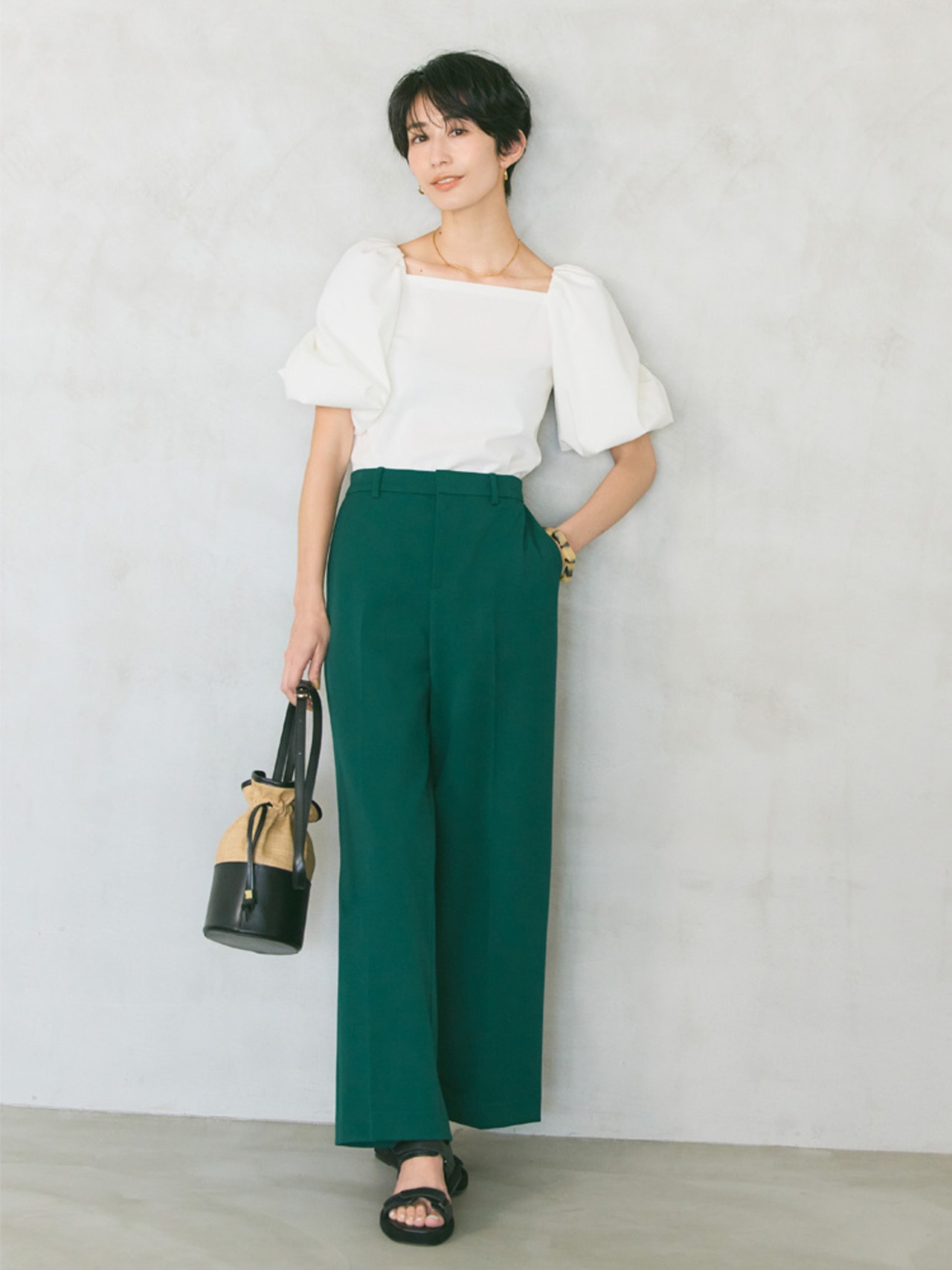 この春夏、人気がヒートアップしたパフスリーブは、パンツ合わせで甘さを調整するのが着こなしの正解。さらに深みのあるグリーンを取り入れるとコントラストがはっきりして、鮮度の高い着映えコーデに。カットソーカットソーuncrave¥8,965(税込)パンツパンツ自由区¥17,930(税込)→¥8,910(税込)Lサイズバングルバングル23区¥4,400(税込)