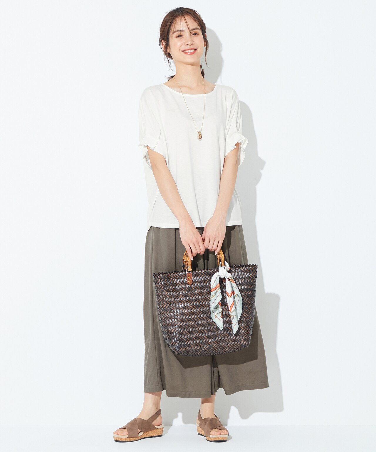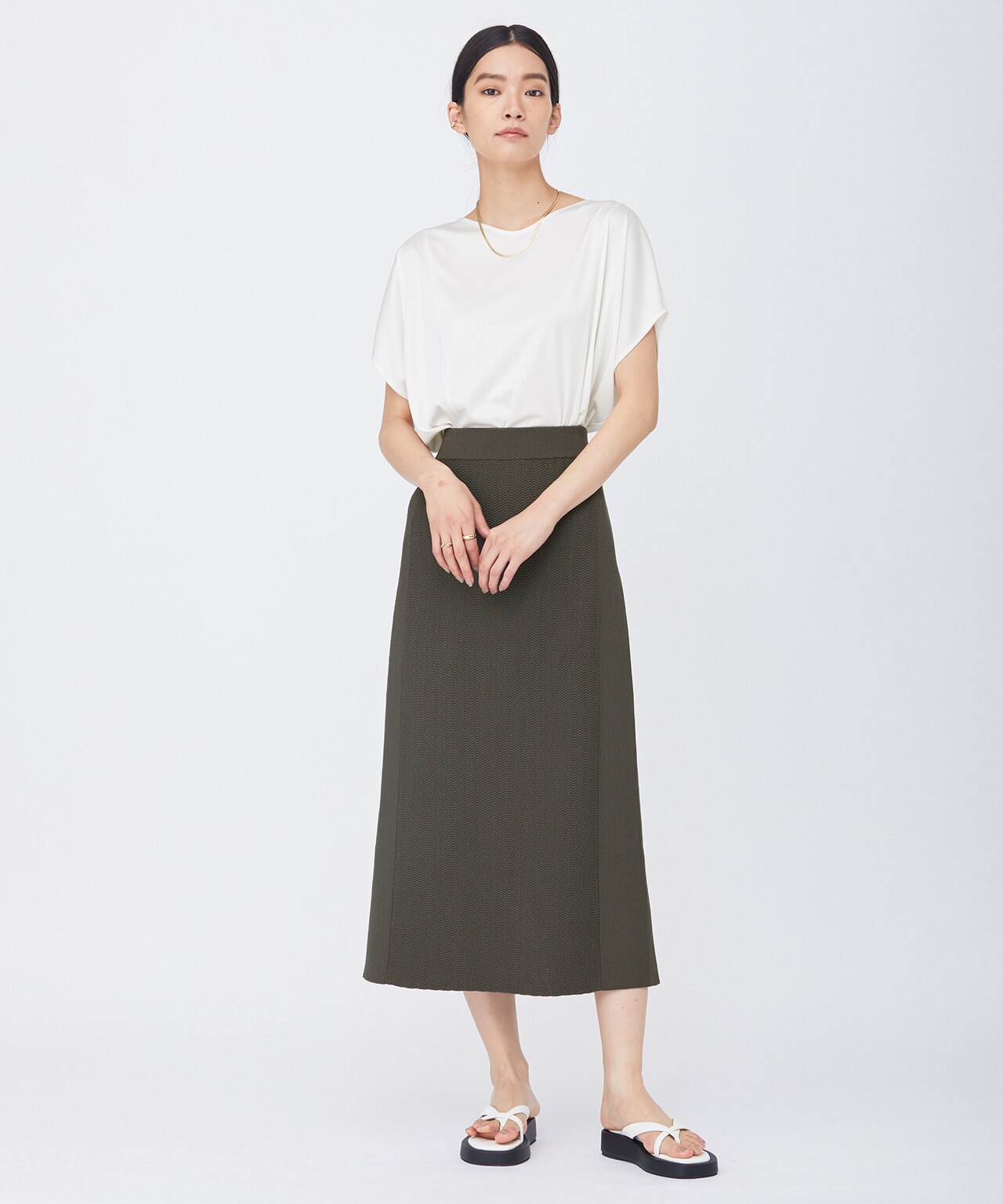 落ち感のあるドルマンTは、ゆったりシルエットでもすっきり。広がりすぎないスカートで縦のラインを強調して大人っぽく。【洗える】トリアセサテンスムースドルマンスリーブカットソー【洗える】トリアセサテンスムースドルマンスリーブカットソーICB¥11,990(税込)スカート / ネックレス / シューズ -
