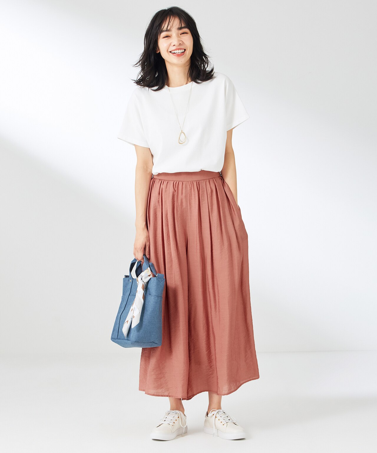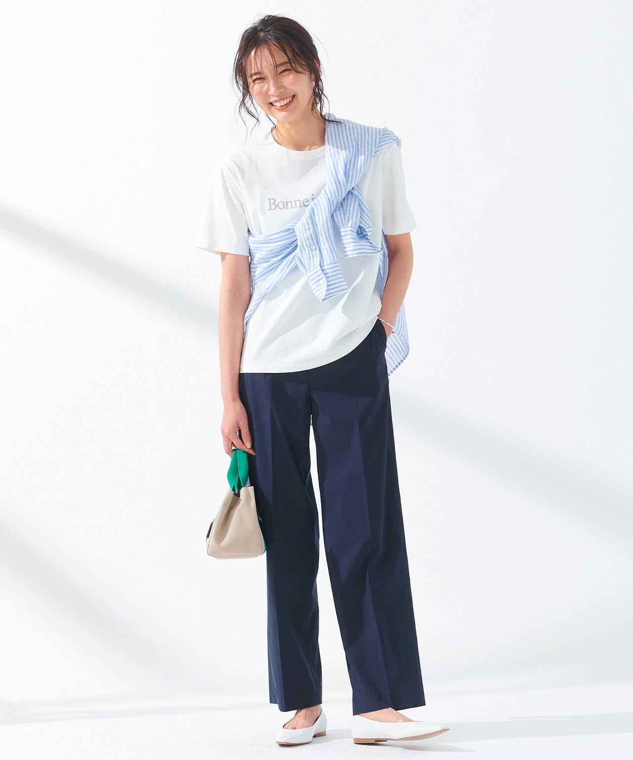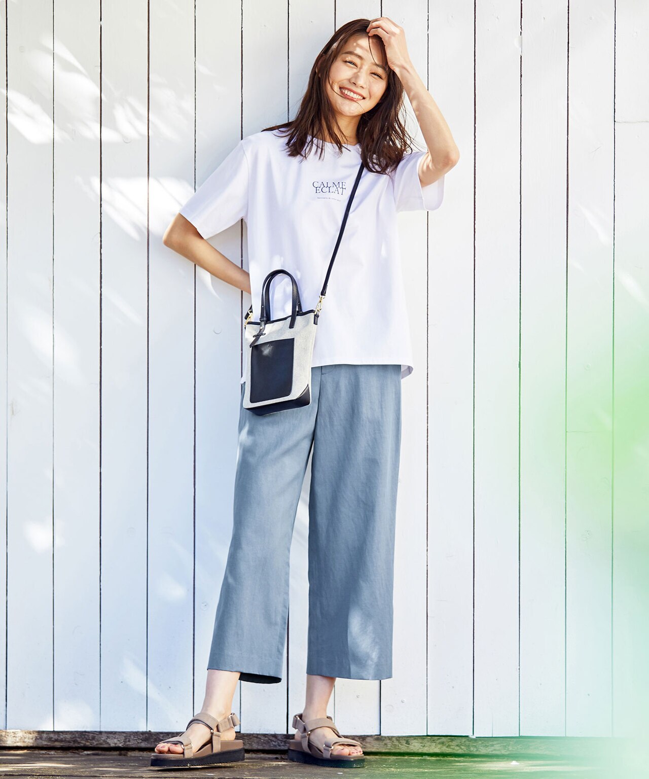 短すぎない袖丈で程よく二の腕をカバー。ゆるっとしたブルーのパンツスタイルも、バックとロゴの色を統一するとシックにまとまる。5分袖ロゴ Tシャツ5分袖ロゴ TシャツJ.PRESS LADIES¥8,690(税込)→¥6,050(税込)パンツ / バッグ / シューズ