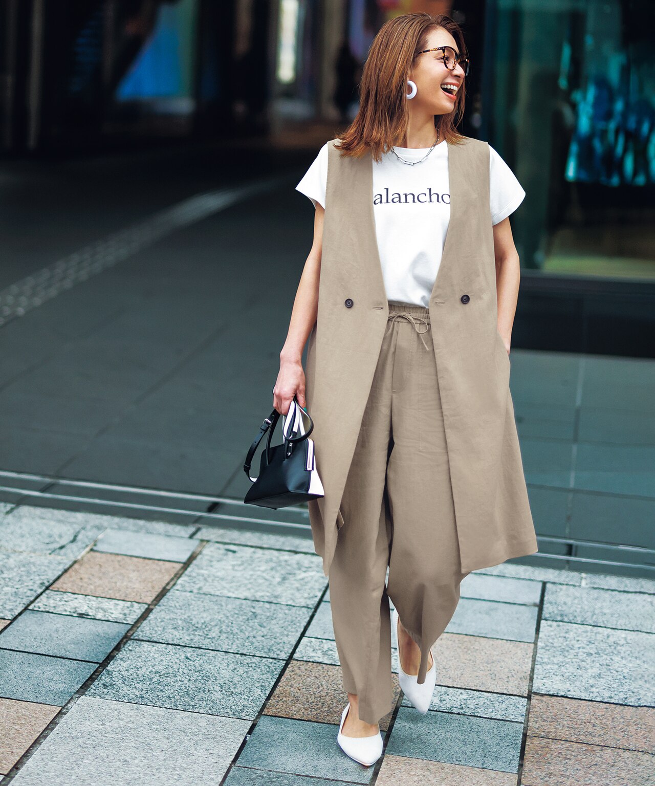 夏の悩みの汗染撥水機能がついたTシャツ。ちらりと見えるロゴが、きちんと感のあるトレンドジレのセットアップも肩肘はらない大人スタイルに。【接触冷感】汗染み撥水ロゴTシャツ【接触冷感】汗染み撥水ロゴTシャツUNFILO¥4,490(税込)→¥1,346(税込)ジレ / パンツ / シューズ