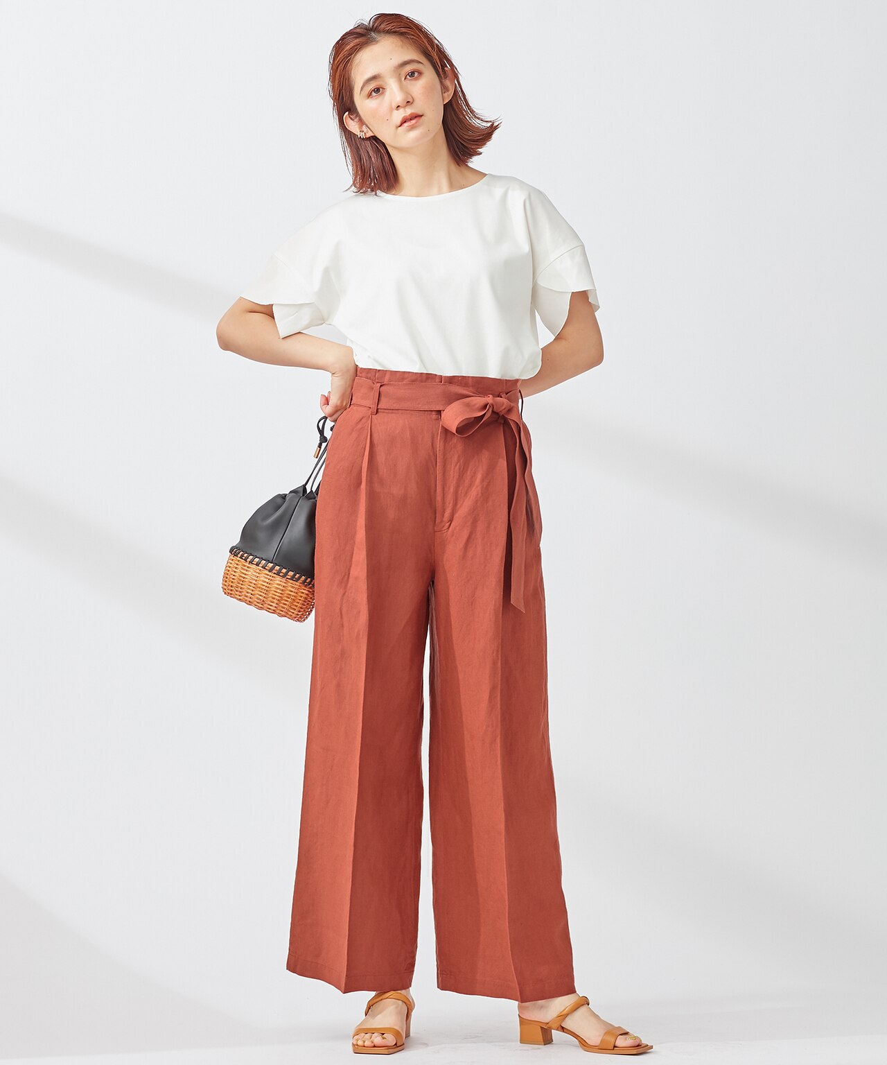 クリアな生地感がきれいな白Tは、さりげない肩落ちラインで程よくカジュアルに。センタープレスのきれいめパンツコーデにラフさをプラス。