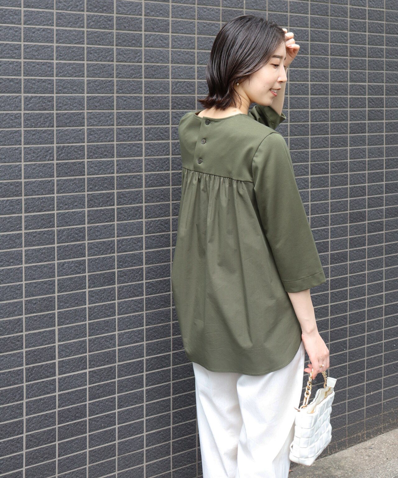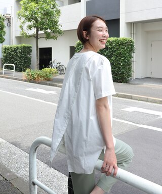ブラウス素材の切り替えできれい目な印象のトップス。着心地はラクなのに着映えるから通勤でも重宝する1枚!