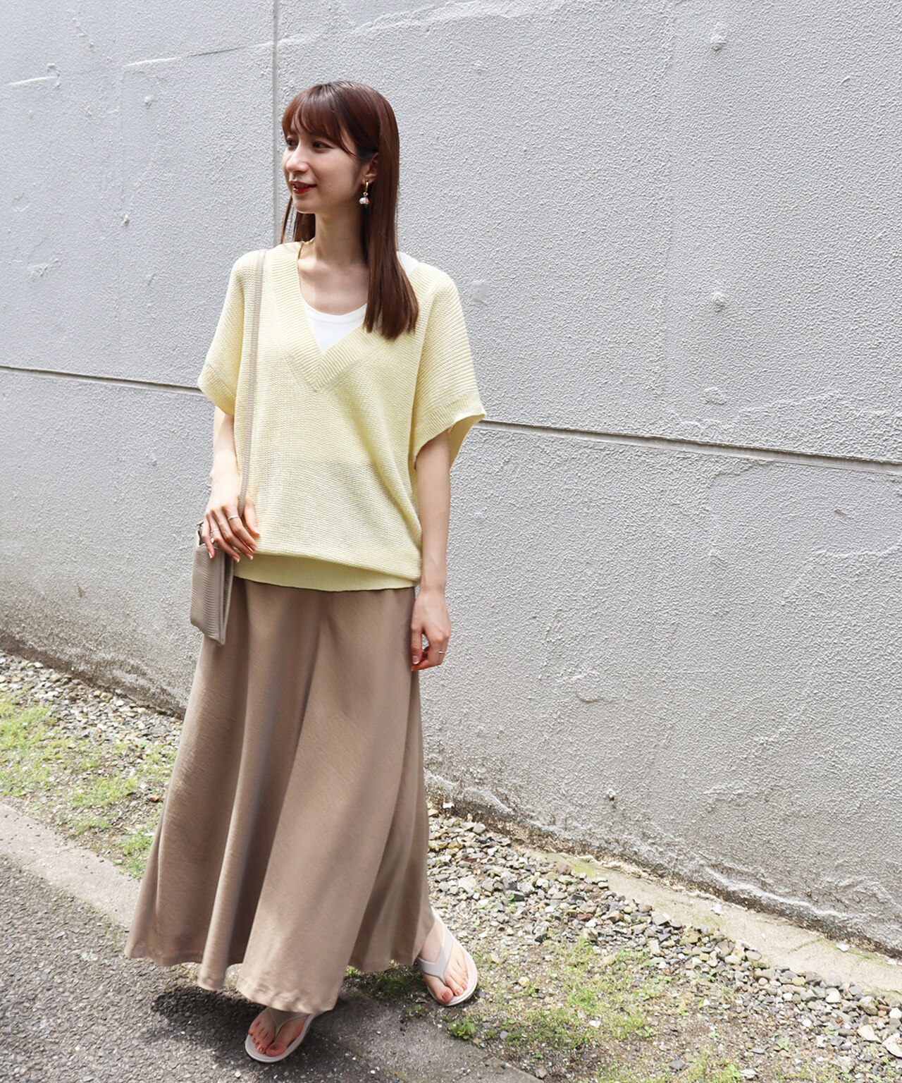 ロングシーズン使えるニットベストはタンクトップをインして涼し気に!スカートはもちろんパンツとのスタイリングもおすすめです。