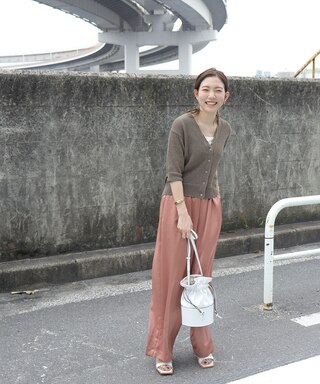 表情のあるショート丈カーディガンはスタイリングに抜け感をプラスしてくれます!サテンパンツとの素材のコントラストでメリハリあるコーデに。