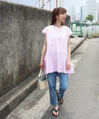 たっっぷりとギャザーを入れたブラウスライクな1枚。ラベンダーの明るい色味にはシンプルにデニムを合わせてカジュアルに!