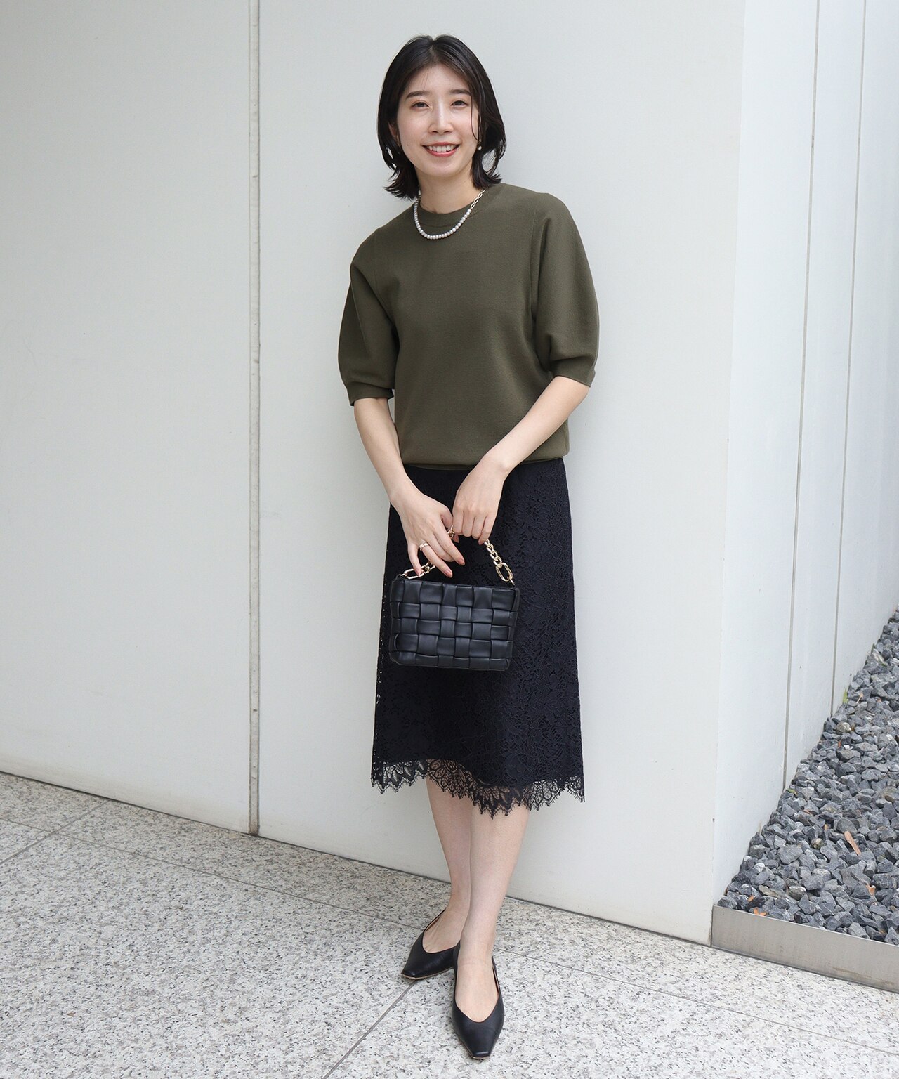 二の腕を隠してくれる5分袖のブラウスはレース素材で軽やかに着られる◎甘くならないデザインでカジュアル派のプラスワンアイテムとしておすすめです!