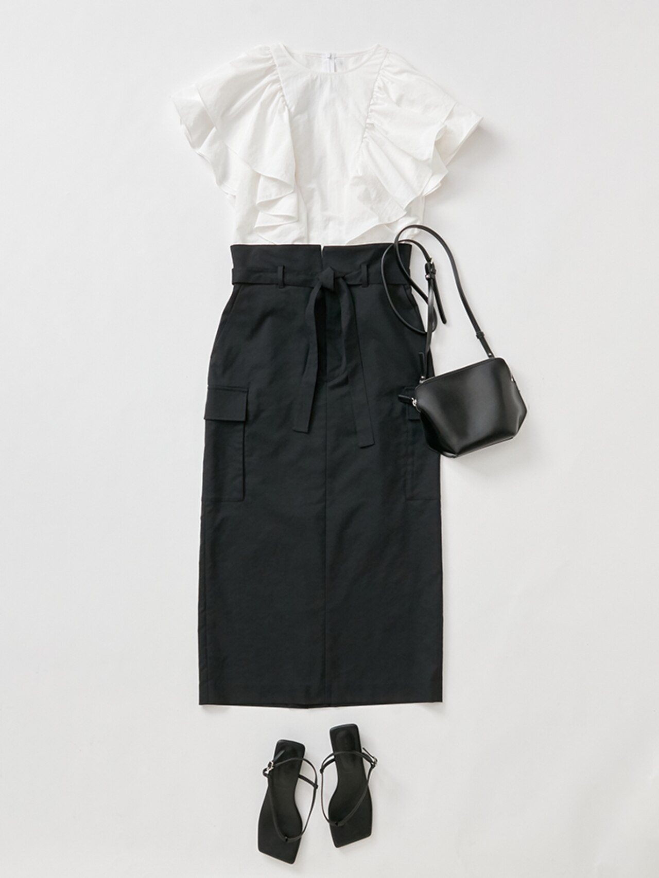 顔周りが華やかになるフリルブラウスは、モノトーン合わせでクールに着こなすのがuncraveらしい。