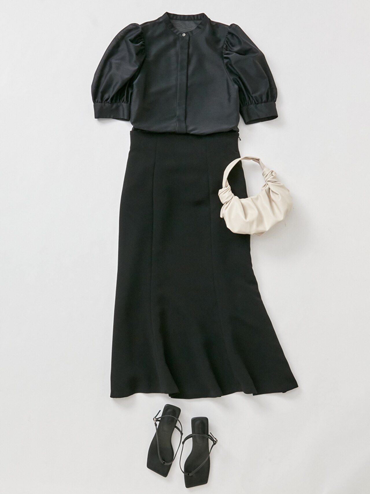 二の腕を隠すブラウスに、マーメイドスカートで着痩せ効果も◎