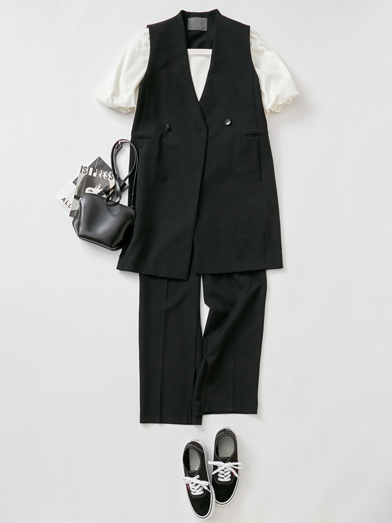 ジャケットセットアップから夏にシフトするにはジレアップ。ブラックを選べば着合わせに迷わないので簡単に取り入れられます。