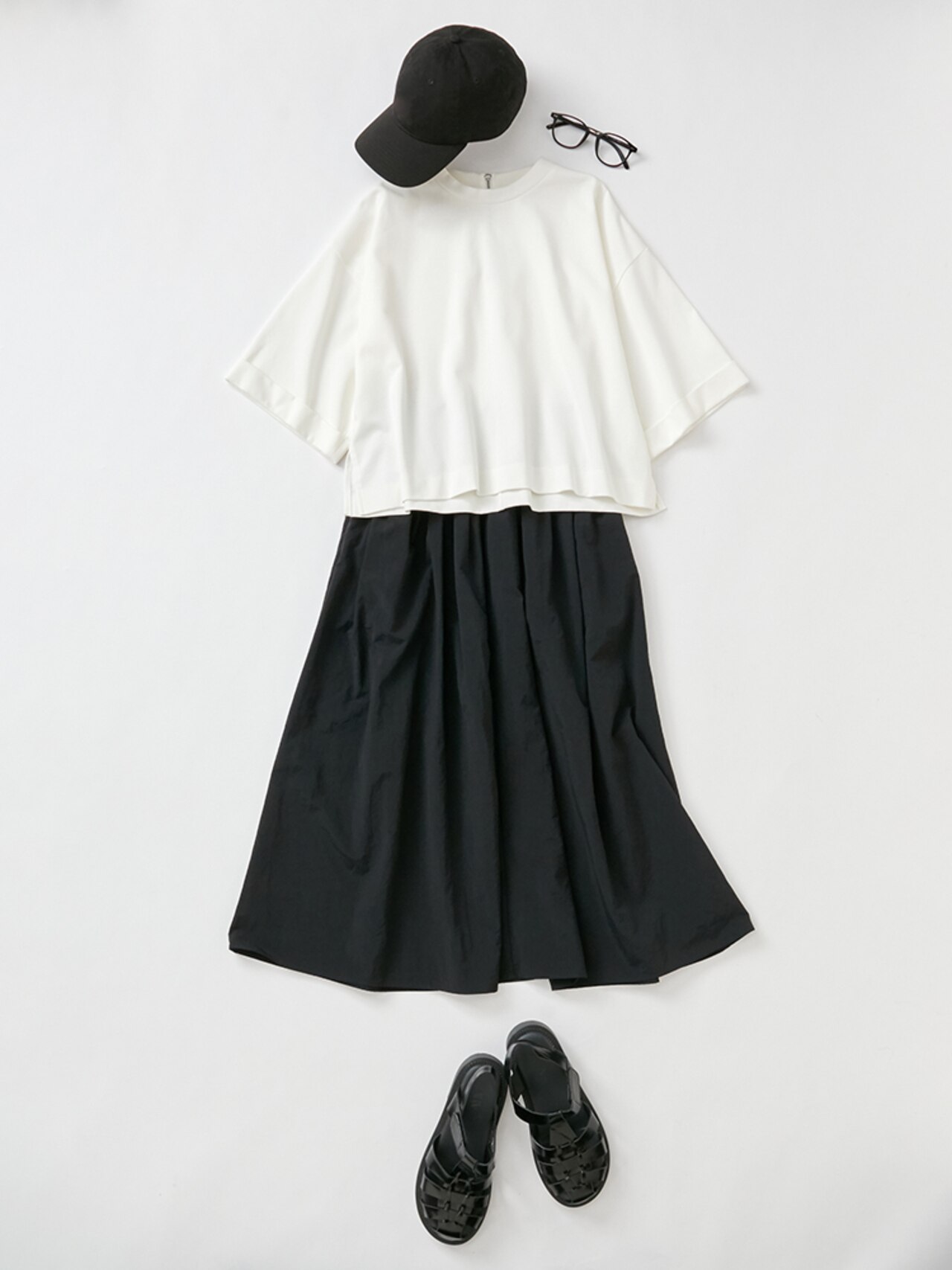 ゆったりとしたシルエットが特徴のTシャツは、着丈を短く作っているので、ボリュームのあるボトムと好相性。モノトーンで組み合わせることで、ゆるっと見えずに引き締まった印象に。