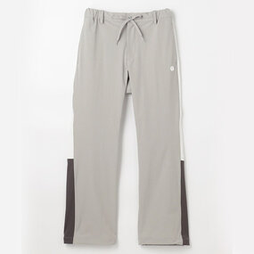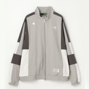 グレーのグラデーションが印象的なトラックジャケットとパンツのセットアップ。大胆なカラーブロッキングがモダンな印象を与えつつ、ゆったりとしたシルエットで動きやすさも抜群。