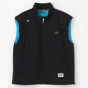 クールにまとめたオールブラックコーデ。雑貨と差し色で大人の遊び心とポップさを表現。軽量で防寒性に優れたベストとトレンドのワイドパンツは、寒さに負けず思い切りスイングできる快適さを約束。