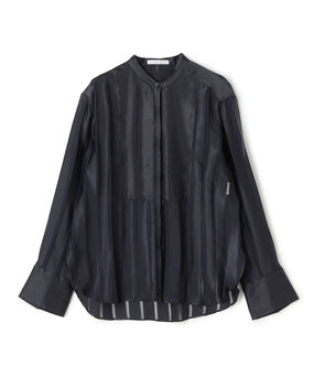 無地×ストライプのコンビネーションが端正な印象。繊細な透け感で上品に仕上げ、ジャケットとも好相性。ホリデーシーンにも映える洗練ブラウス。