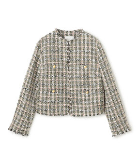 軽やかなオリジナルツイードに、フリンジと塗装ボタンが映える上品な一枚。丸みのあるシルエットで、ブラウスやニットとも好相性。