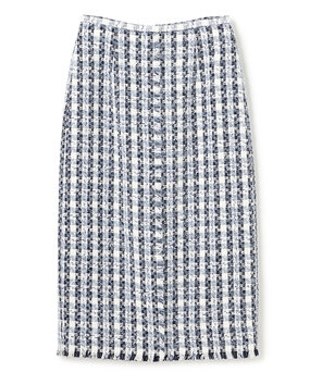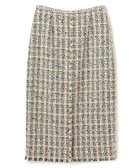 縦ラインが美しいツイードスカート。フリンジと前ベントで動きやすく、同素材ジャケットとのセットアップもおすすめ。