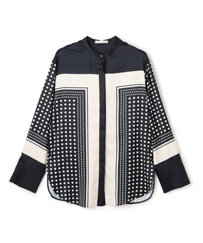 程よいゆとりで体型を選ばないバンドカラーブラウス。モノトーン柄が、シンプルなのに印象的。パンツにもスカートにも好相性な着丈が合わせやすく、さらりと快適な着心地で、季節を問わず活躍!