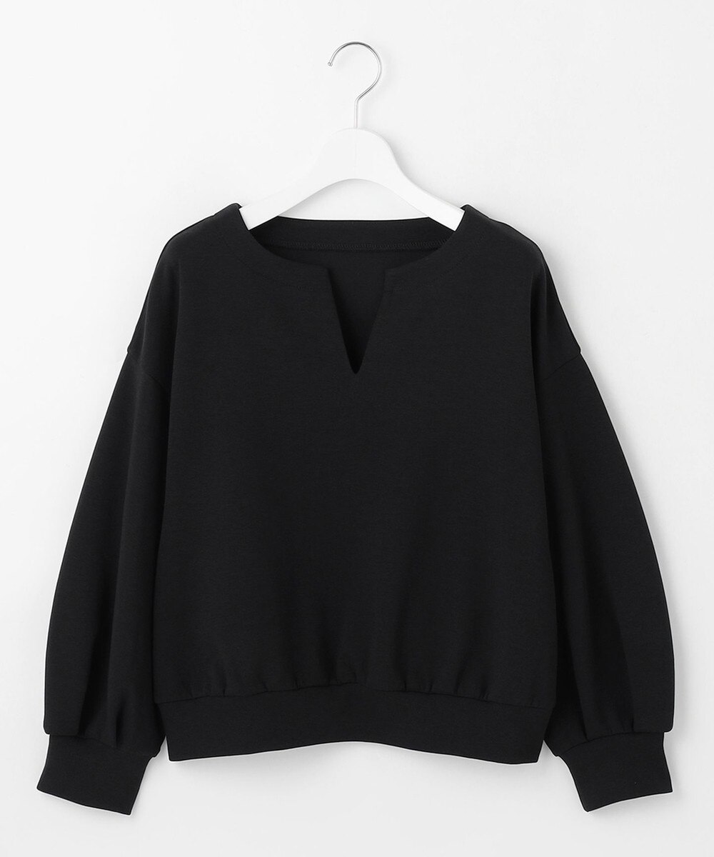 キーネックが新鮮なプルオーバースウェット。ニット代わりに着まわせて洗える便利な1着。絶妙な肌みせのネックラインが大人っぽさをプラス。