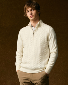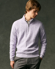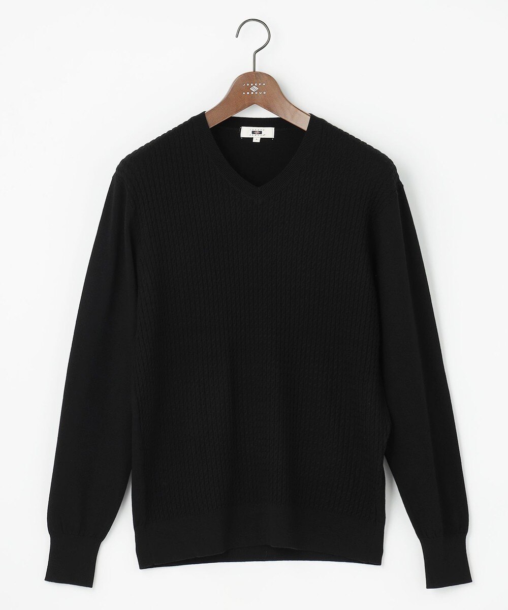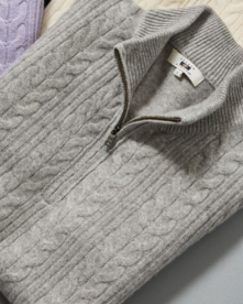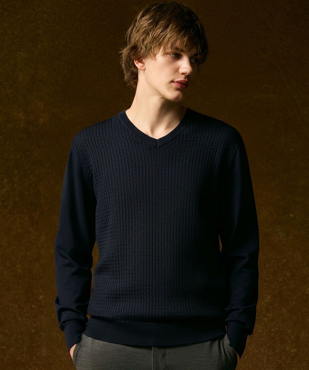 前身頃には7ゲージで編み上げた立体的なケーブル編みを施し、上品な表情を演出。袖と後身頃は12ゲージの天竺編みで薄手に仕上げることで、ジャケットやアウターを羽織っても着膨れせず、すっきりとスマートに着こなせるよう工夫しました。